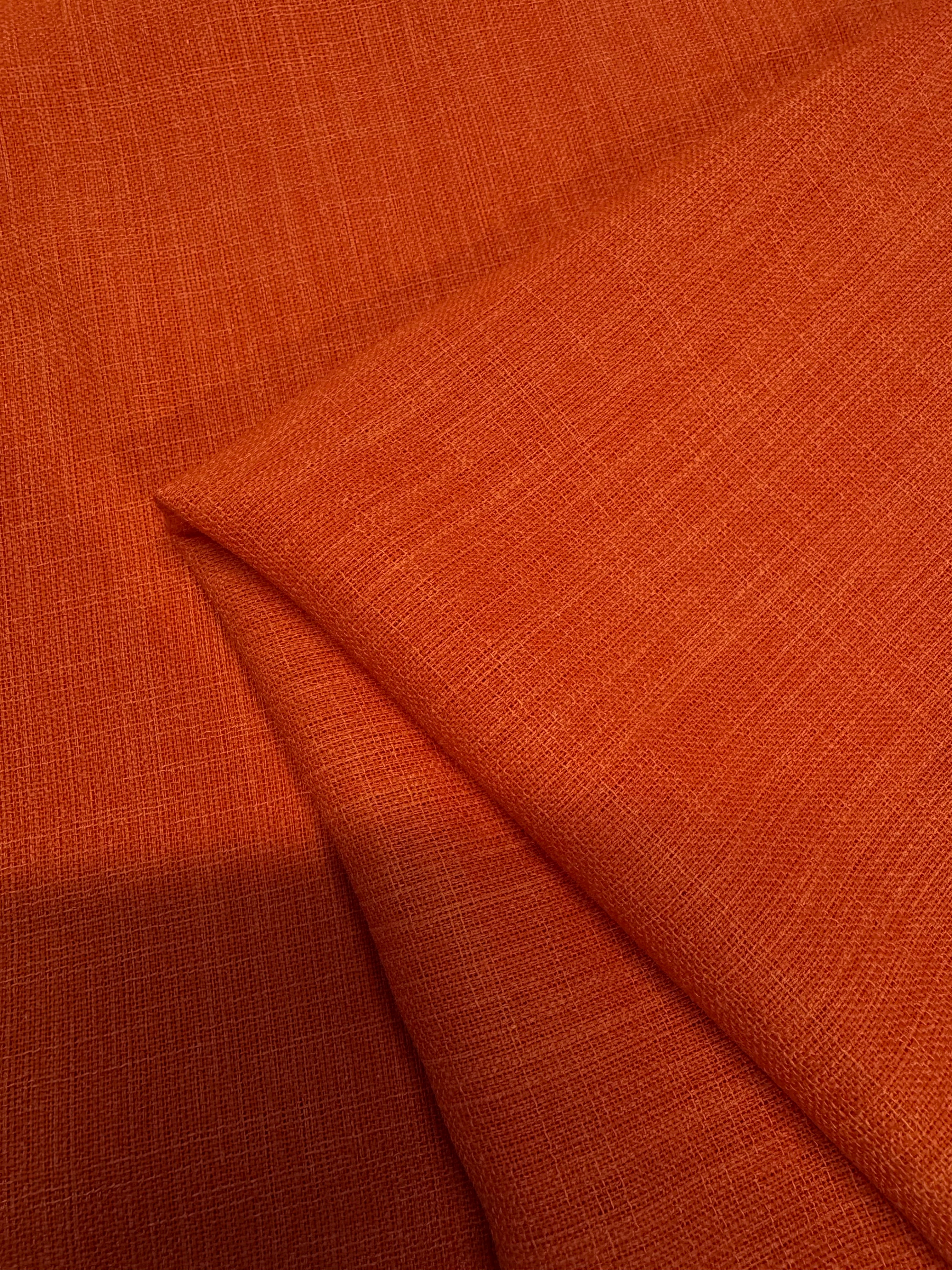 A close-up of Crepe - Puffin’s Bill - 112cm from Super Cheap Fabrics in orange, showing lightweight polyester fabric with a fine woven pattern, one piece flat and another folded—ideal for elegant evening gowns.