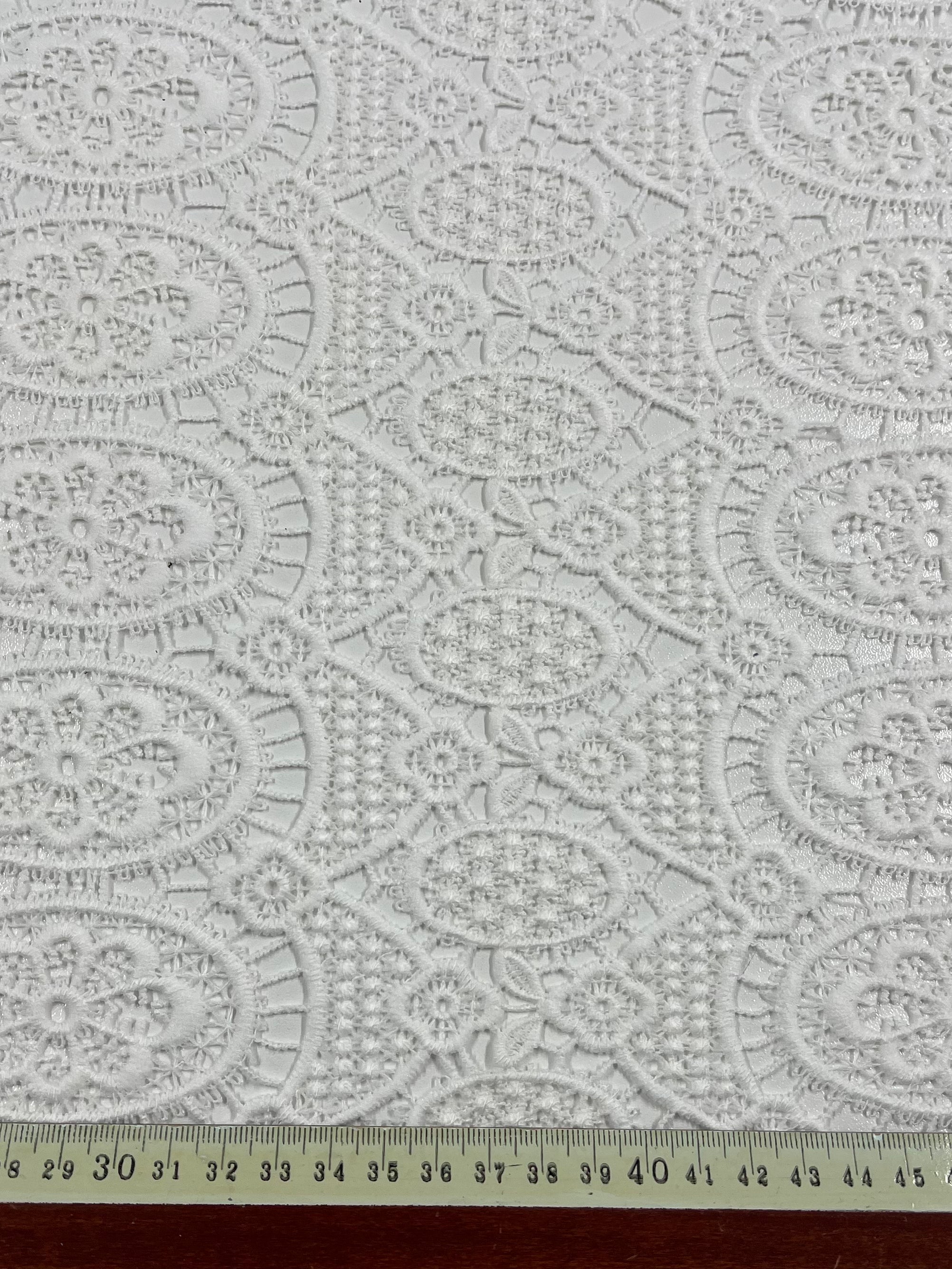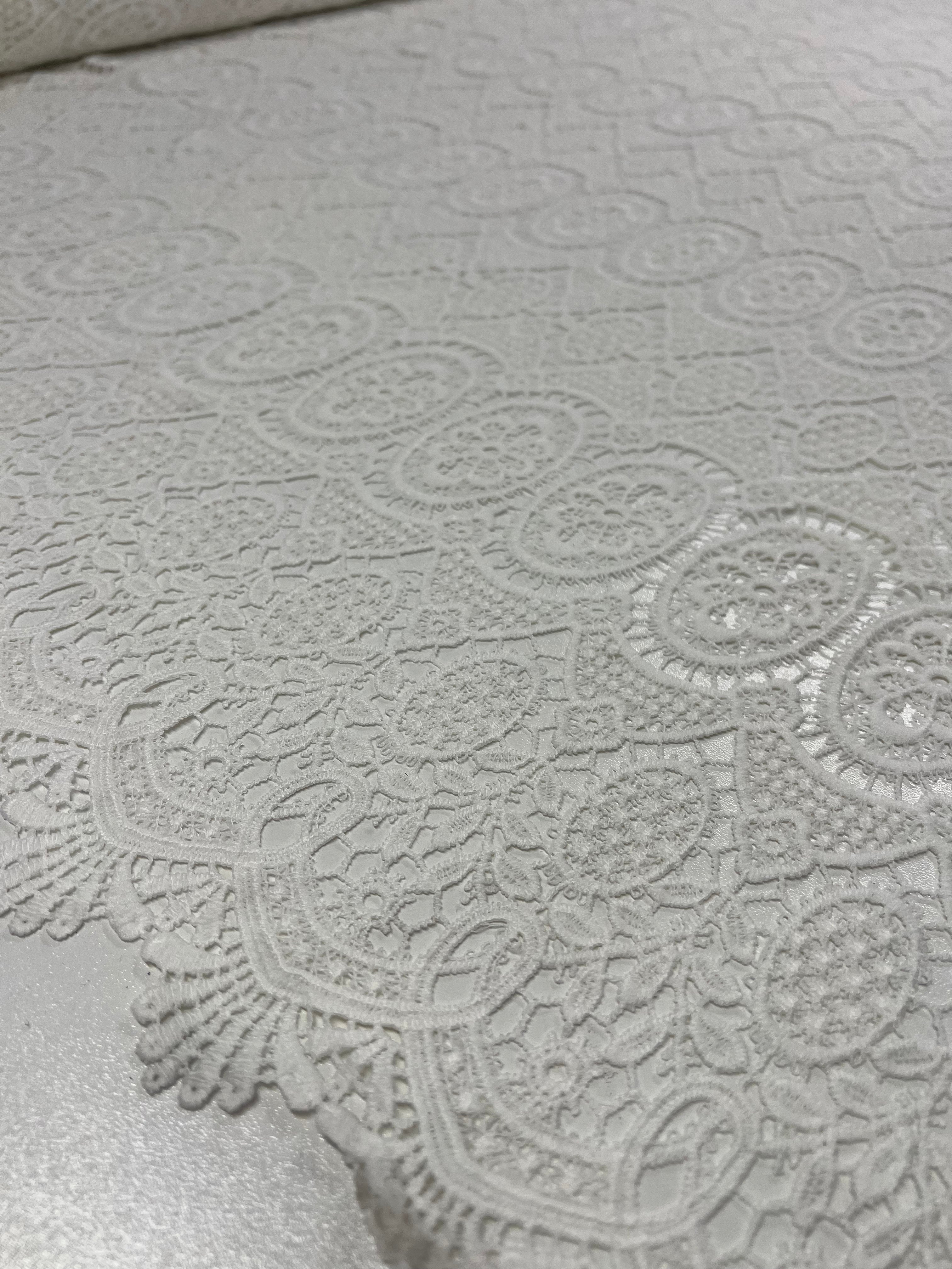 Close-up of an intricate lace fabric with a delicate, detailed pattern featuring floral and geometric designs. The ivory fabric is 116 CM wide and has a soft, elegant texture. The edges have a scalloped, lace trim made from high-quality polyester. This is the Designer Anglaise Lace - Guipure - 116cm by Super Cheap Fabrics.