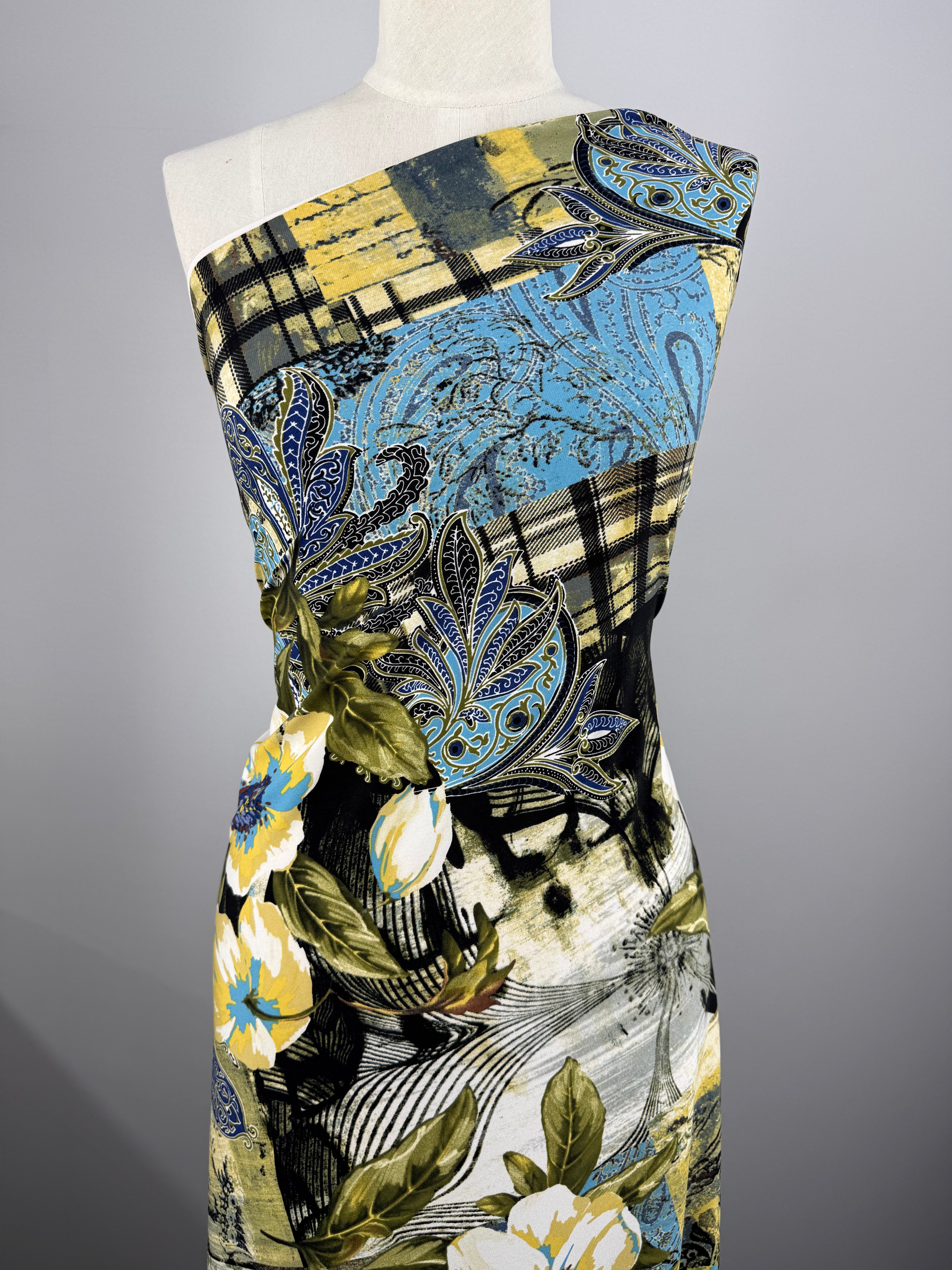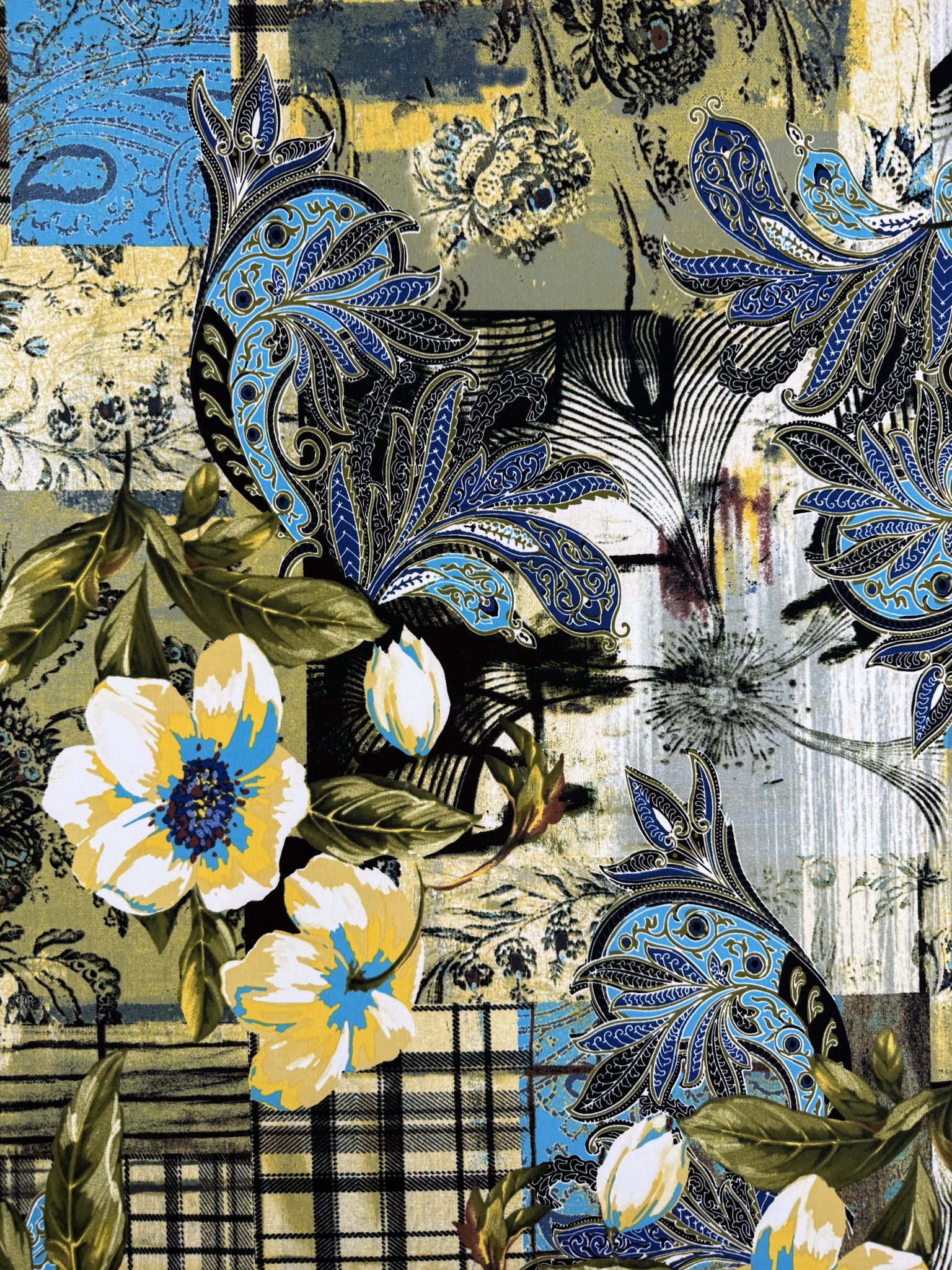 Our Printed Lycra is a Polyester/Spandex fabric that has a two-way stretch and comes in a variety of beautiful prints! Printed Lycra is a medium-weight fabric, has good durability and stretch, and washes well. Our Lycras are perfect for making tops, dresses, skirts, pants, accessories, and even childrenswear. A statement-making print that blends multiple classic motifs into a bold patchwork composition.
