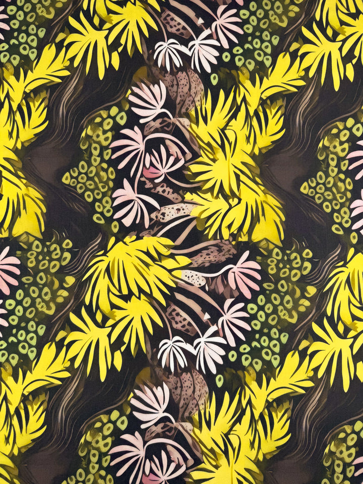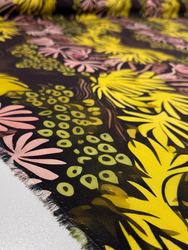 Our Designer Rayon showcases a beautiful and colourful fabric with vibrant prints that can be used for various purposes such as dresses, skirts, blouses, curtains, and more. Our collection showcases a soft, lightweight fabric with a smooth drape and a luxurious feel. Overall, rayon fabric offers both comfort and style, making it a versatile choice for any project. Earthwood draws inspiration from the forest floor, featuring layered foliage in deep greens, soft blush, and vivid yellow highlights over a dark earthy base.