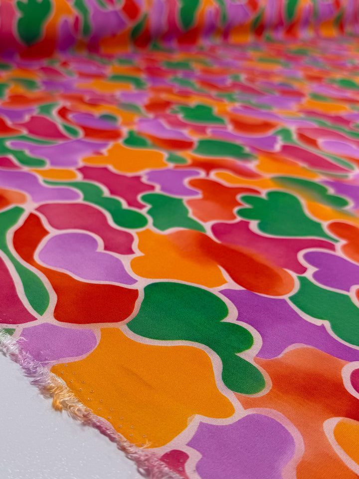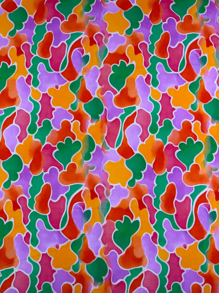 Our Designer Rayon showcases a beautiful and colourful fabric with vibrant prints that can be used for various purposes such as dresses, skirts, blouses, curtains, and more. Our collection showcases a soft, lightweight fabric with a smooth drape and a luxurious feel. Overall, rayon fabric offers both comfort and style, making it a versatile choice for any project. Fiesta Cloud bursts with playful abstract shapes in shades of lilac, tangerine, rose, and leafy green, each outlined in white for a soft painterly effect.
