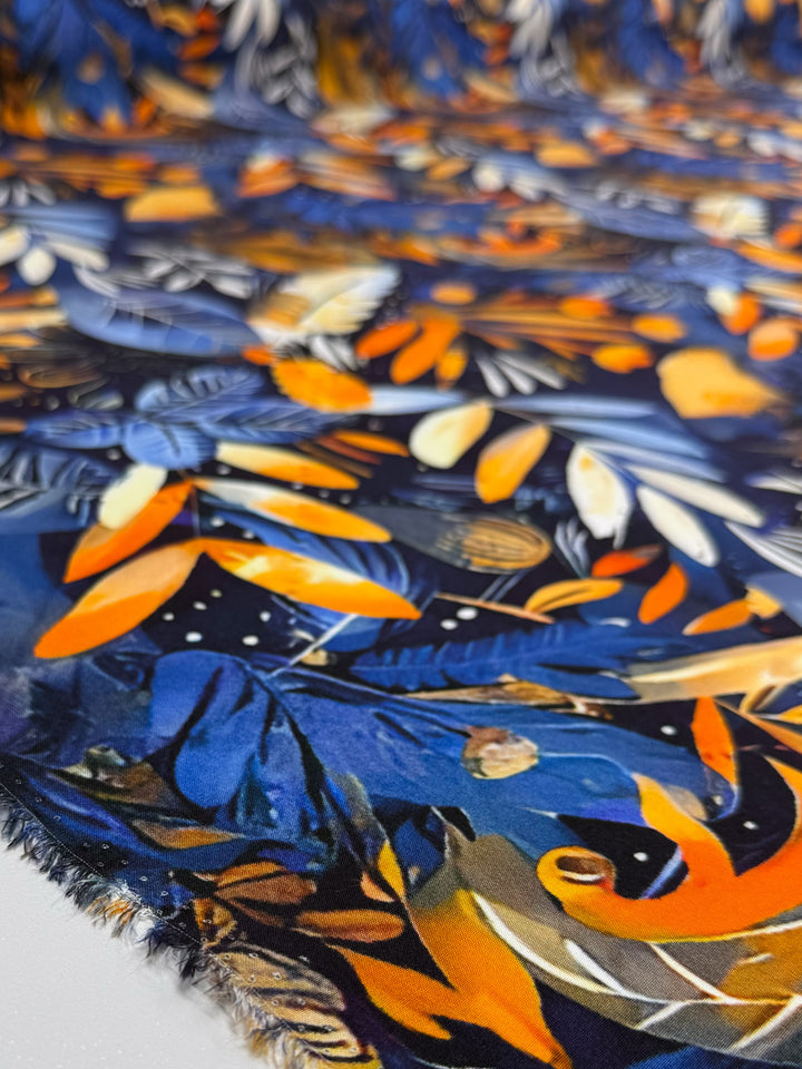 Our Designer Rayon showcases a beautiful and colourful fabric with vibrant prints that can be used for various purposes such as dresses, skirts, blouses, curtains, and more. Our collection showcases a soft, lightweight fabric with a smooth drape and a luxurious feel. Overall, rayon fabric offers both comfort and style, making it a versatile choice for any project. Midnight Tropic showcases an expressive leaf pattern in shades of cobalt, amber, and ivory layered over a rich navy base.