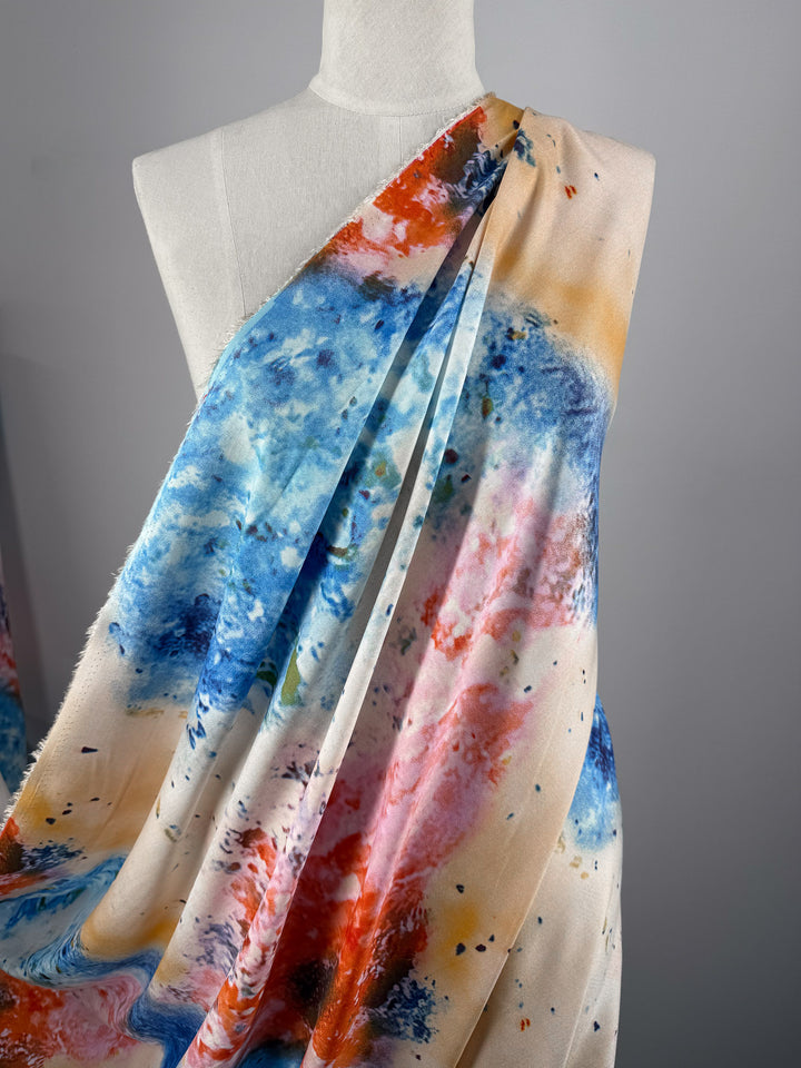 A soft cream base with abstract splashes of blue, coral, and sand tones.