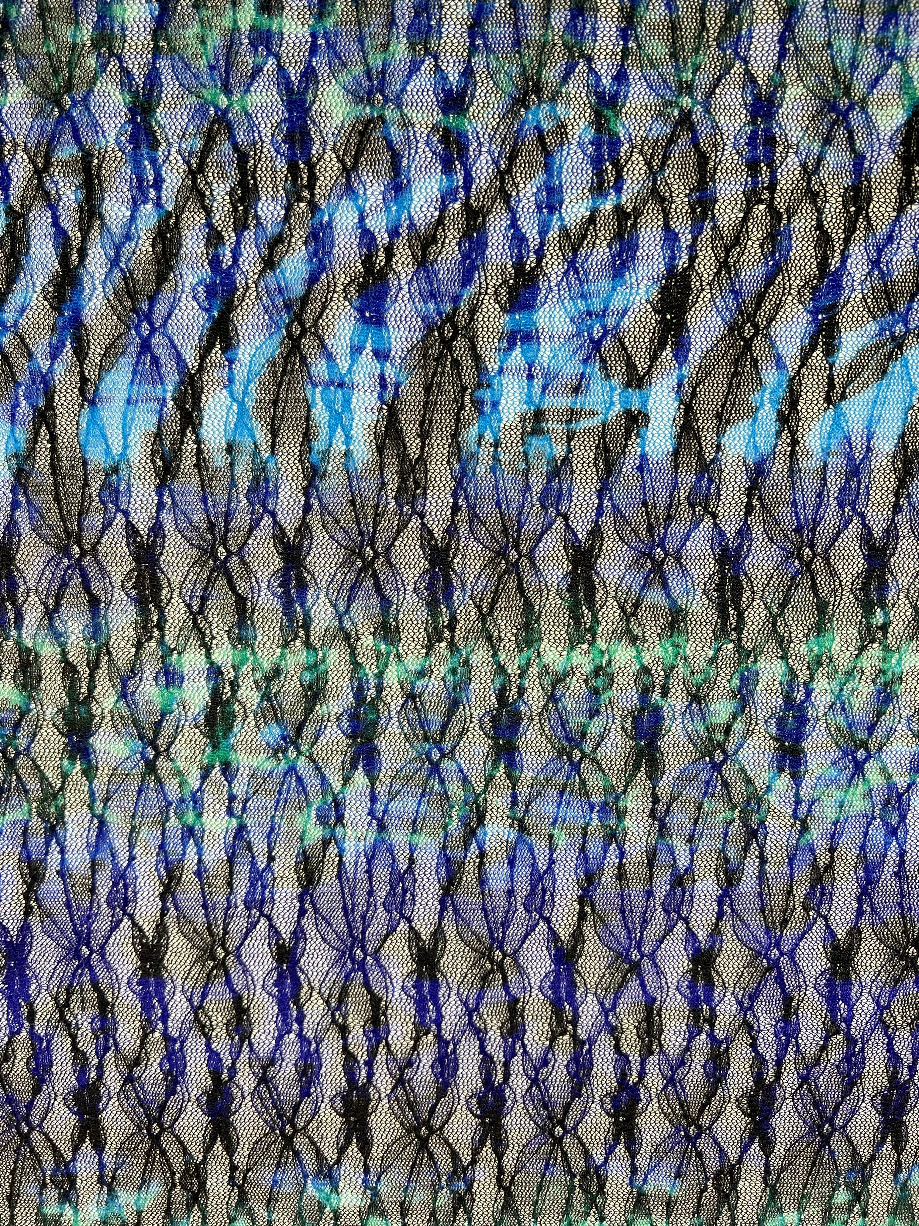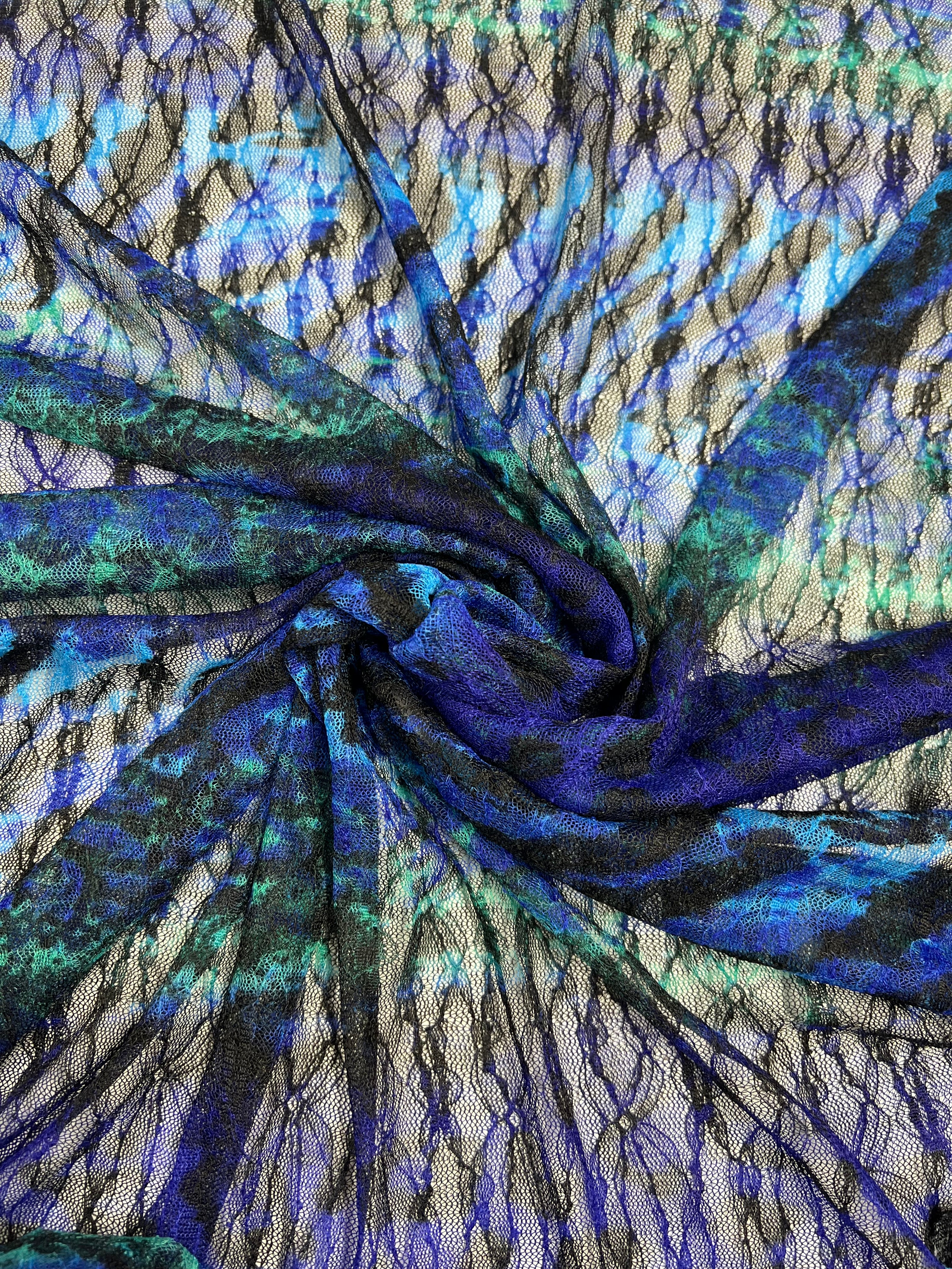 A close-up of Evening Lace - Avatar - 140cm from Super Cheap Fabrics, intricately woven with various shades of blue and green. The lightweight sheer fabric is arranged in a swirling, spiral design, showcasing its texture and the interplay of colors—perfect for dresses and skirts.