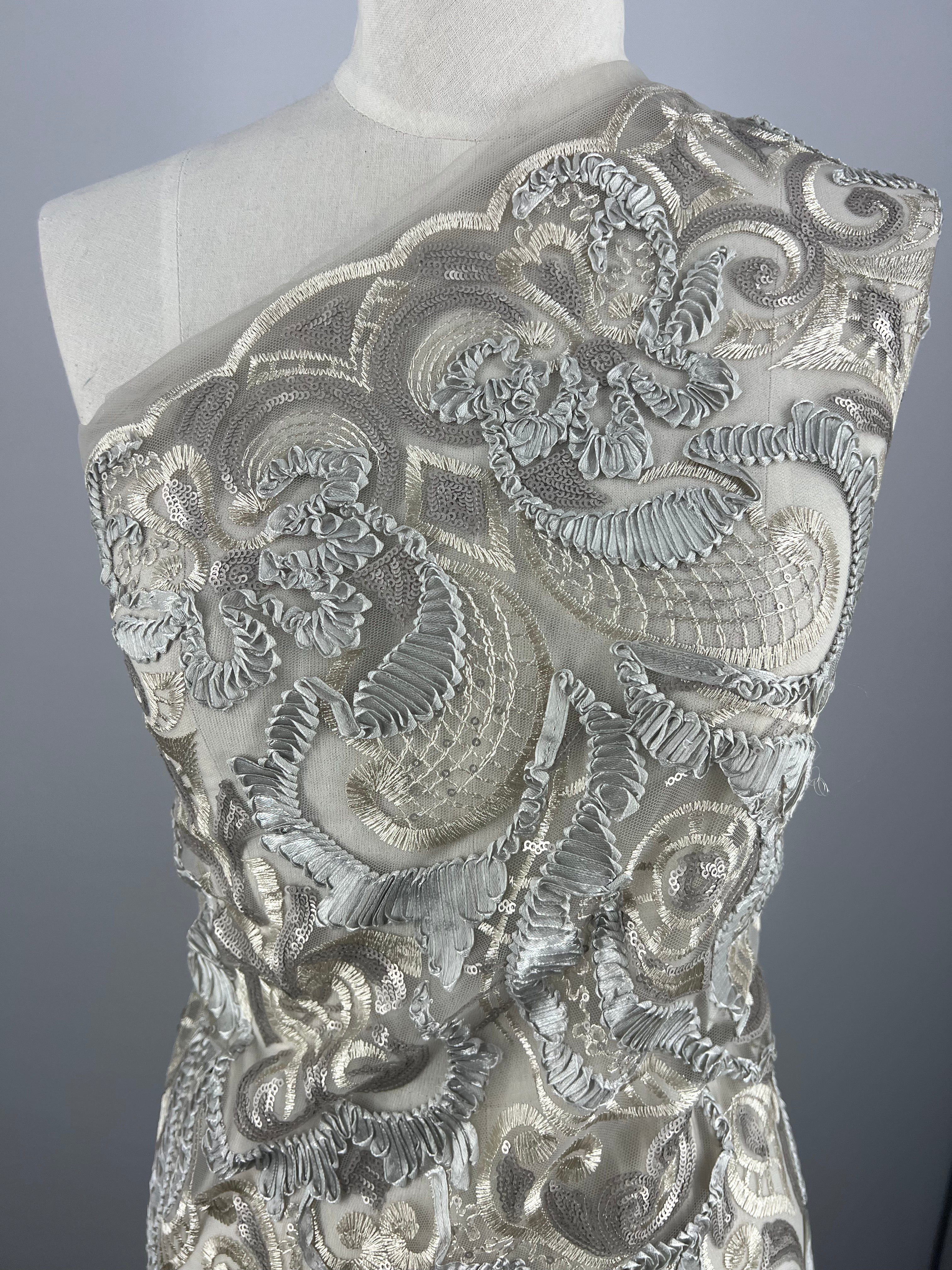 A close-up photo of a mannequin draped in Embroidery on Tulle- 150cm - Jewel - 150cm by Super Cheap Fabrics. The fabric, a medium weight material, features intricate, swirling patterns in shades of silver and grey, creating a luxurious and textured appearance. The background is plain, highlighting the detailed design of the fabric.