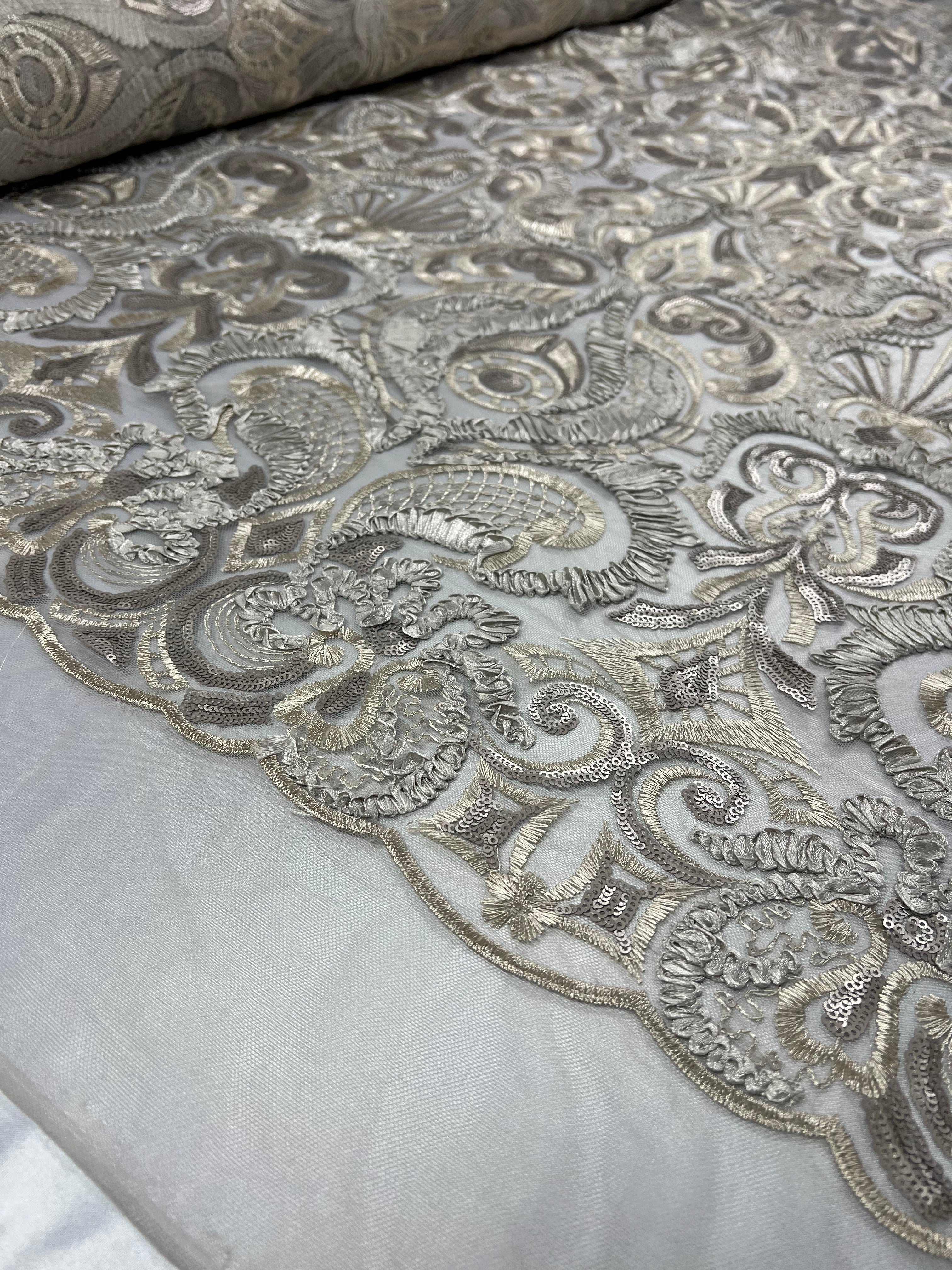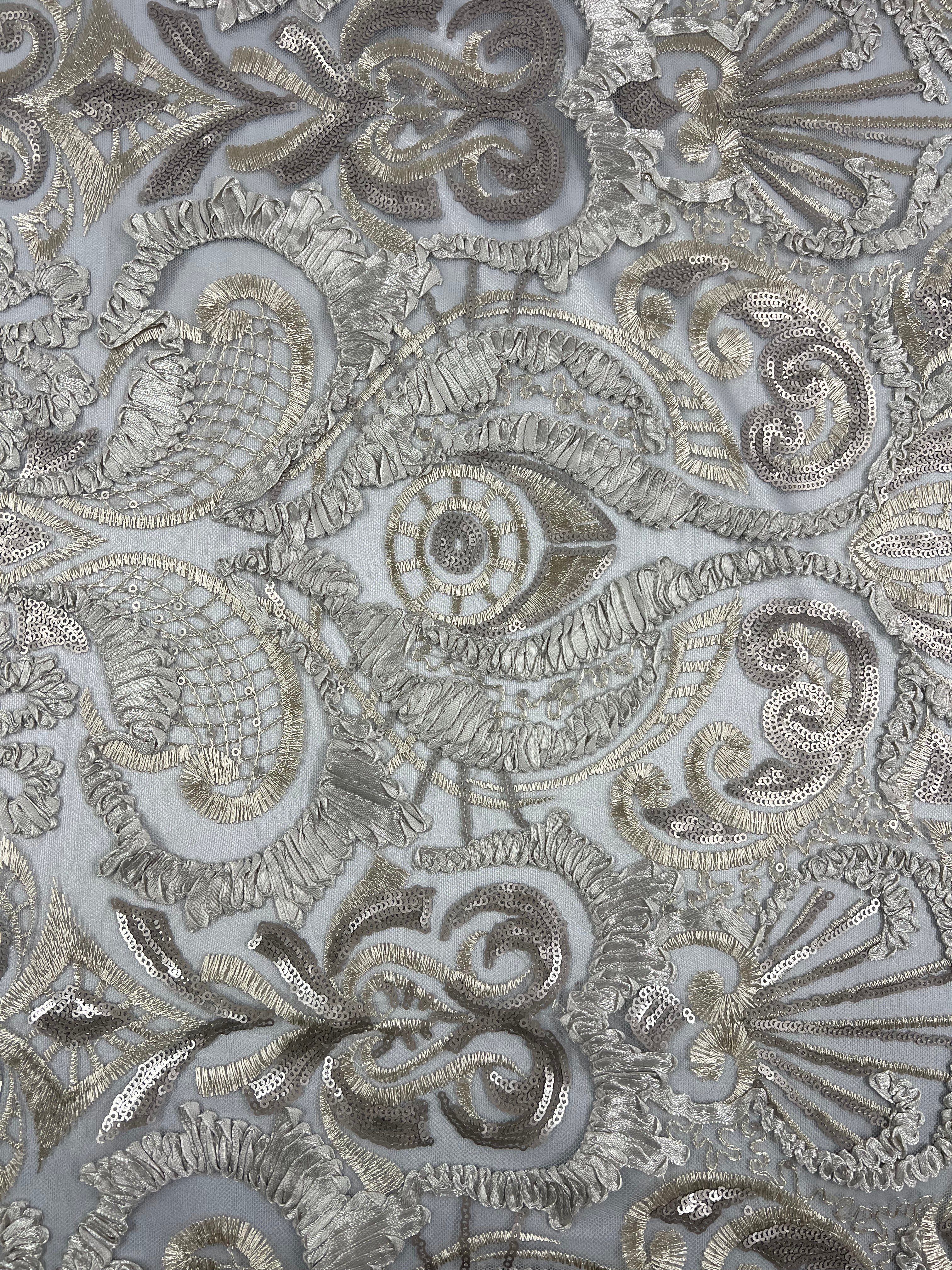 A close-up image of intricate silver and gray embroidery on medium weight fabric. The pattern includes swirling lines, floral shapes, and textured designs, creating an elaborate and ornate appearance. The delicate stitching gives the fabric a luxurious and detailed look. This is Embroidery on Tulle - 150cm - Jewel - 150cm from Super Cheap Fabrics.