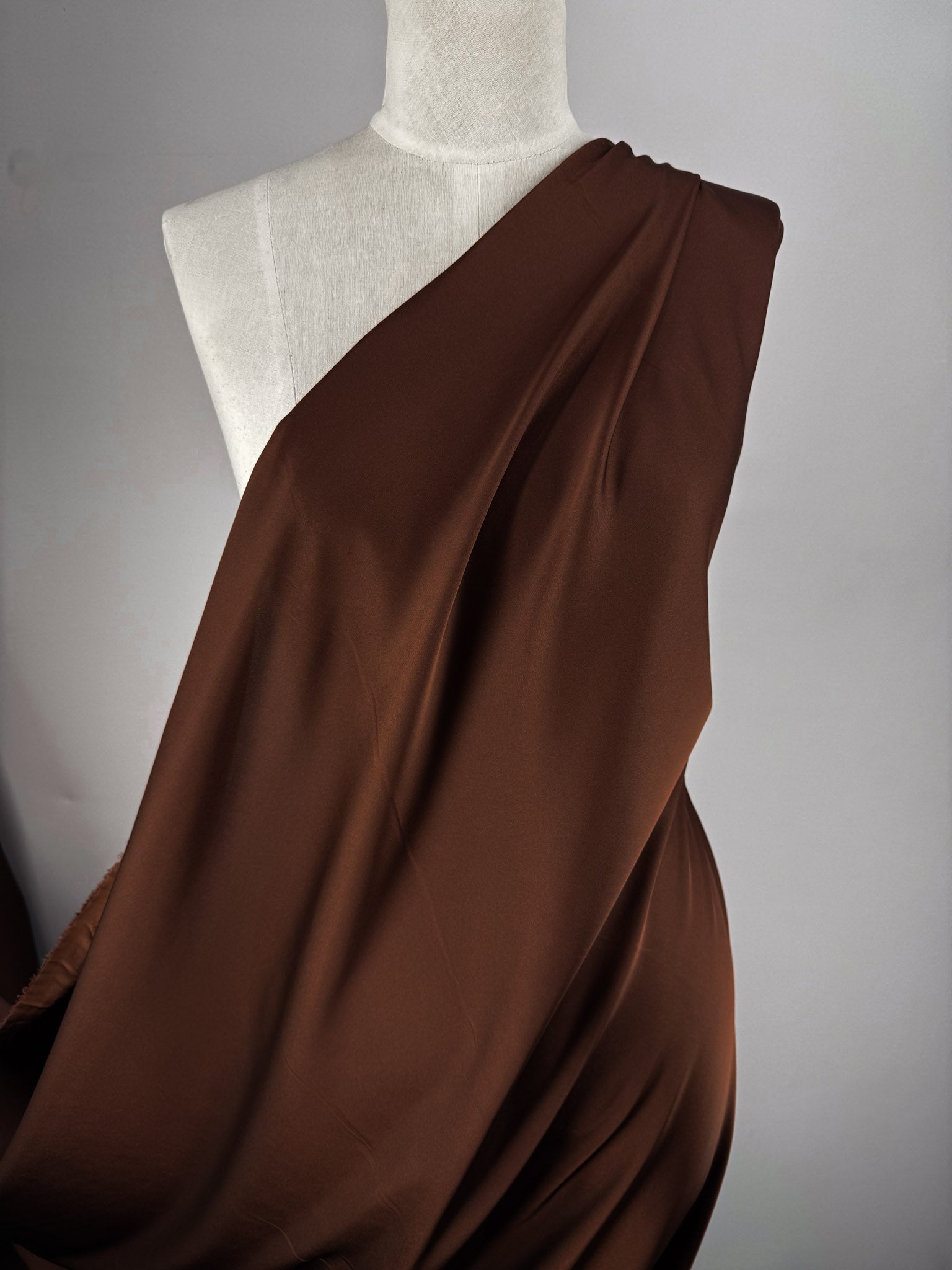 A matte, luxury fabric often used for nightgowns. Satin refers to the weave, not the textile, and most fabrics characterised as satin have a soft, shiny yet matte finish. No spandex however this satin has some give.