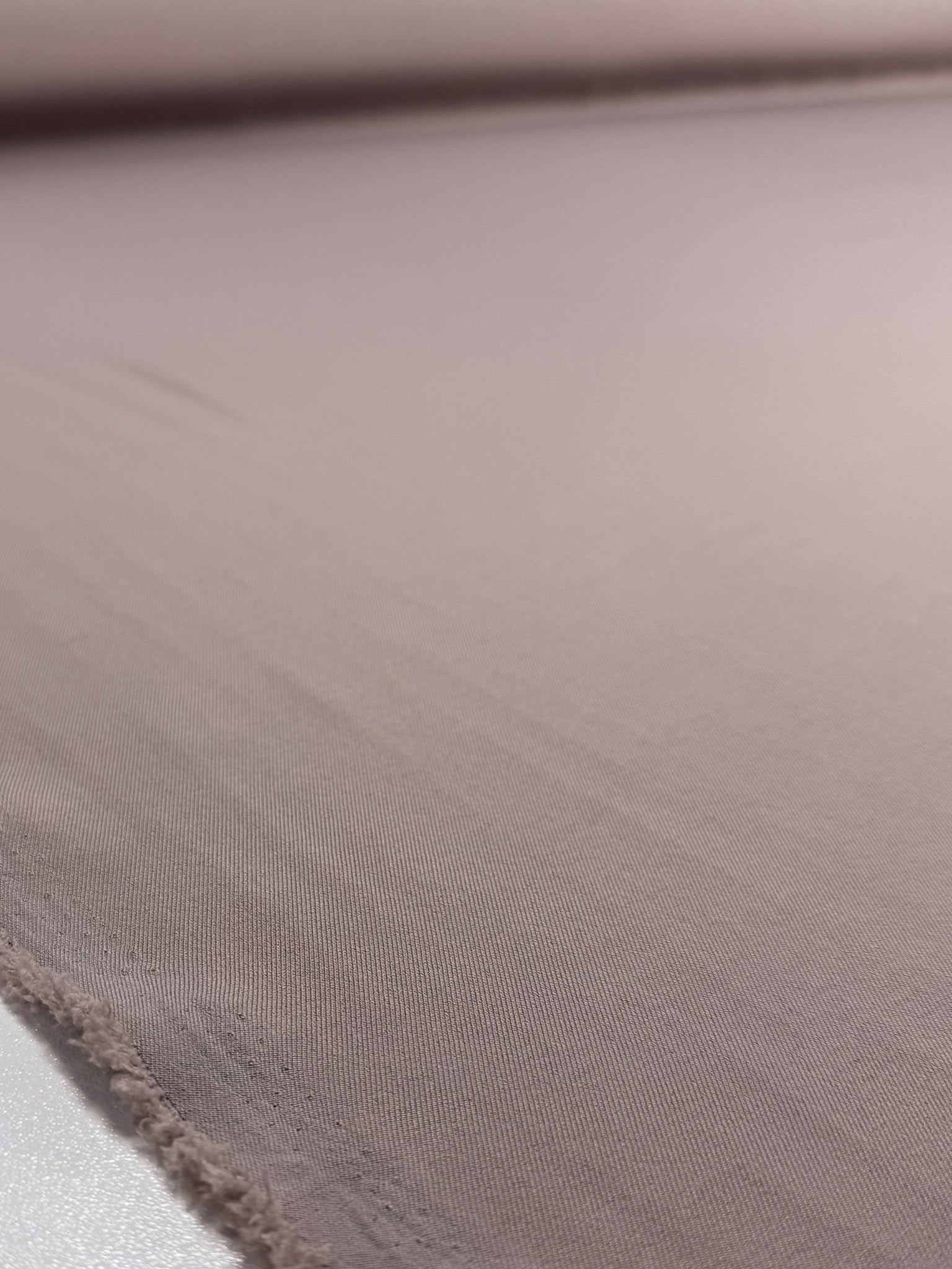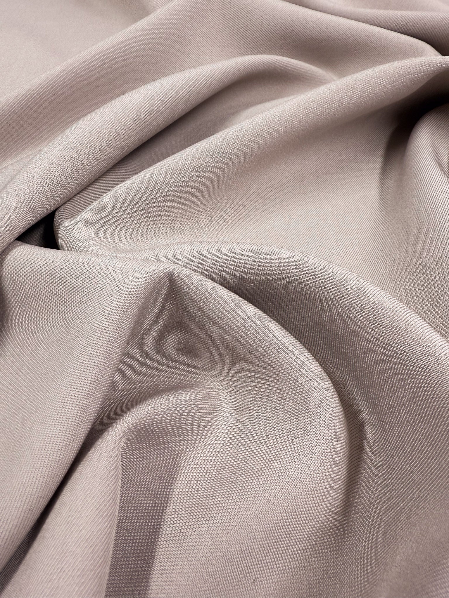 Close-up of Liquid Twill - Goat by Super Cheap Fabrics, a light taupe 150cm suiting fabric featuring a smooth texture, soft drape, fluidity, and subtle sheen—showcasing the classic qualities of fine polyester twill.
