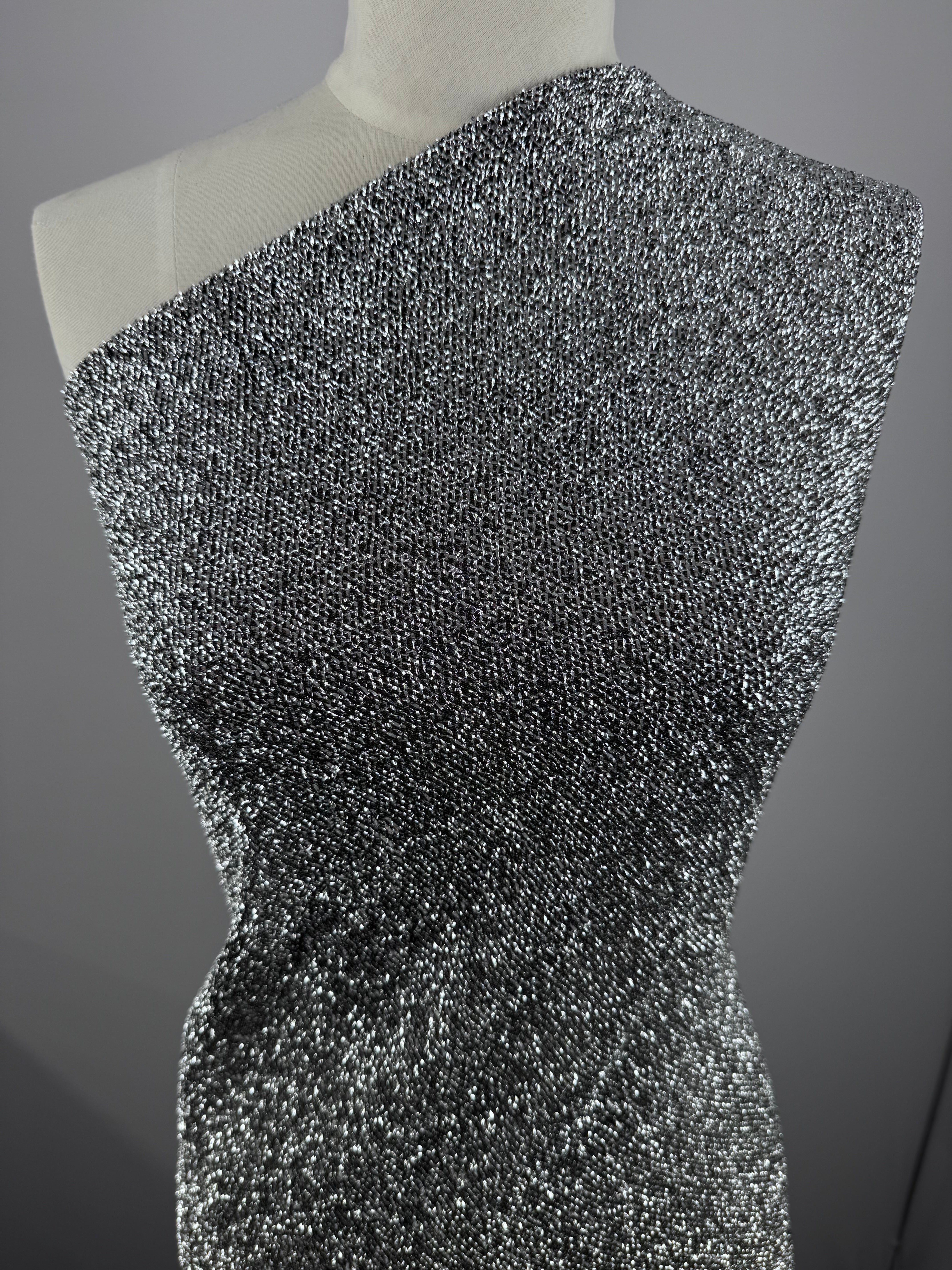A soft, flexible Lurex Stretch Knit designed with a subtle shimmer and a comfortable stretch. This fabric drapes beautifully, offering a smooth feel with added elasticity that makes it easy to sew and flattering to wear. The knitted structure provides breathability while the metallic thread adds a touch of refinement, making it ideal for both casual and elevated looks. Versatile, durable, and perfect for garments or creative projects that need movement and a hint of shine.