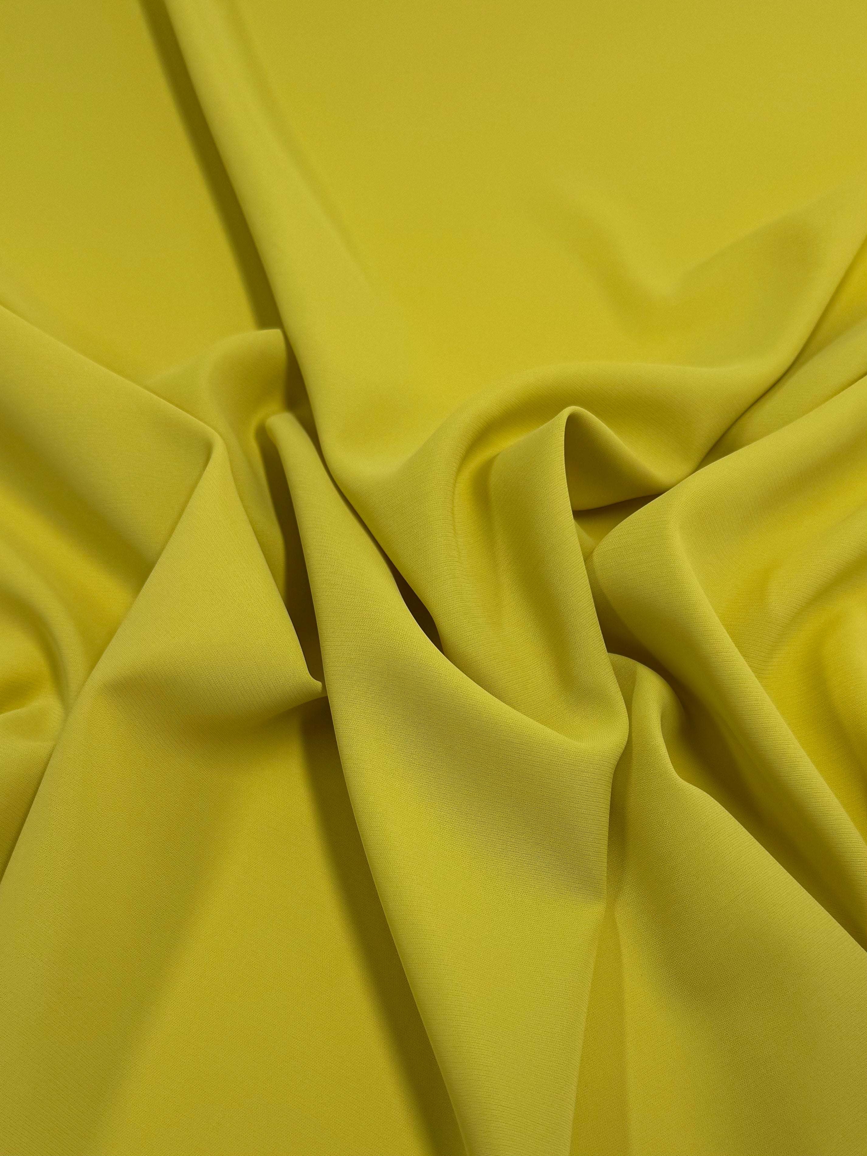 A close-up of Super Cheap Fabrics' Microfibre Suiting - Mango Mint (150cm) shows bright yellow fabric with soft folds and gentle draping, giving it a smooth texture with a slightly wrinkled look.