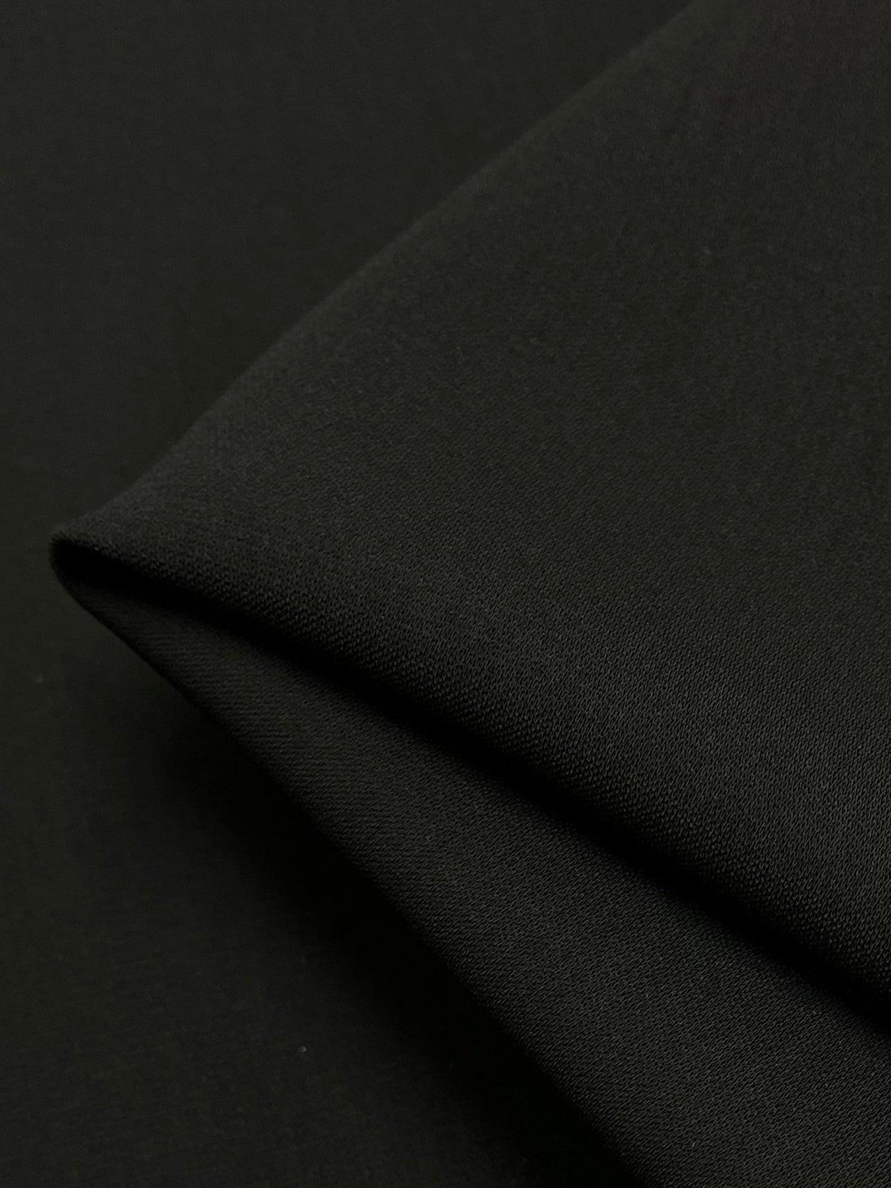 A close-up of Super Cheap Fabrics' Microfibre Suiting - Black - 150cm, a medium weight black polyester fabric with a smooth texture. The fabric is slightly folded at the corner, creating an overlap that highlights its softness and quality under subtle lighting.