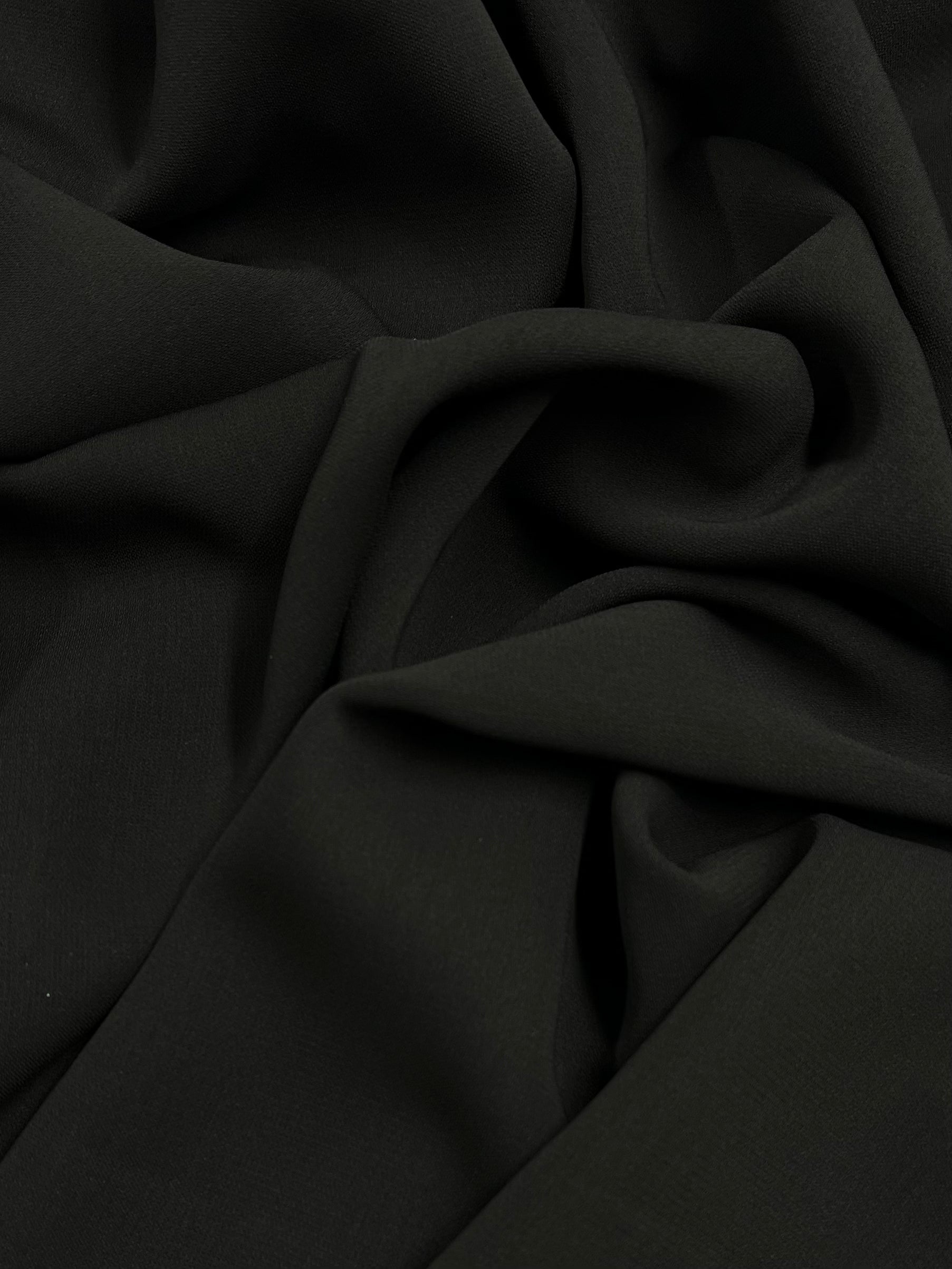 A close-up of medium weight black polyester fabric, displaying smooth folds and creases. The material appears soft and slightly shiny, with the light subtly highlighting the textures and depth of the fabric. This is Super Cheap Fabrics' Microfibre Suiting - Black - 150cm.