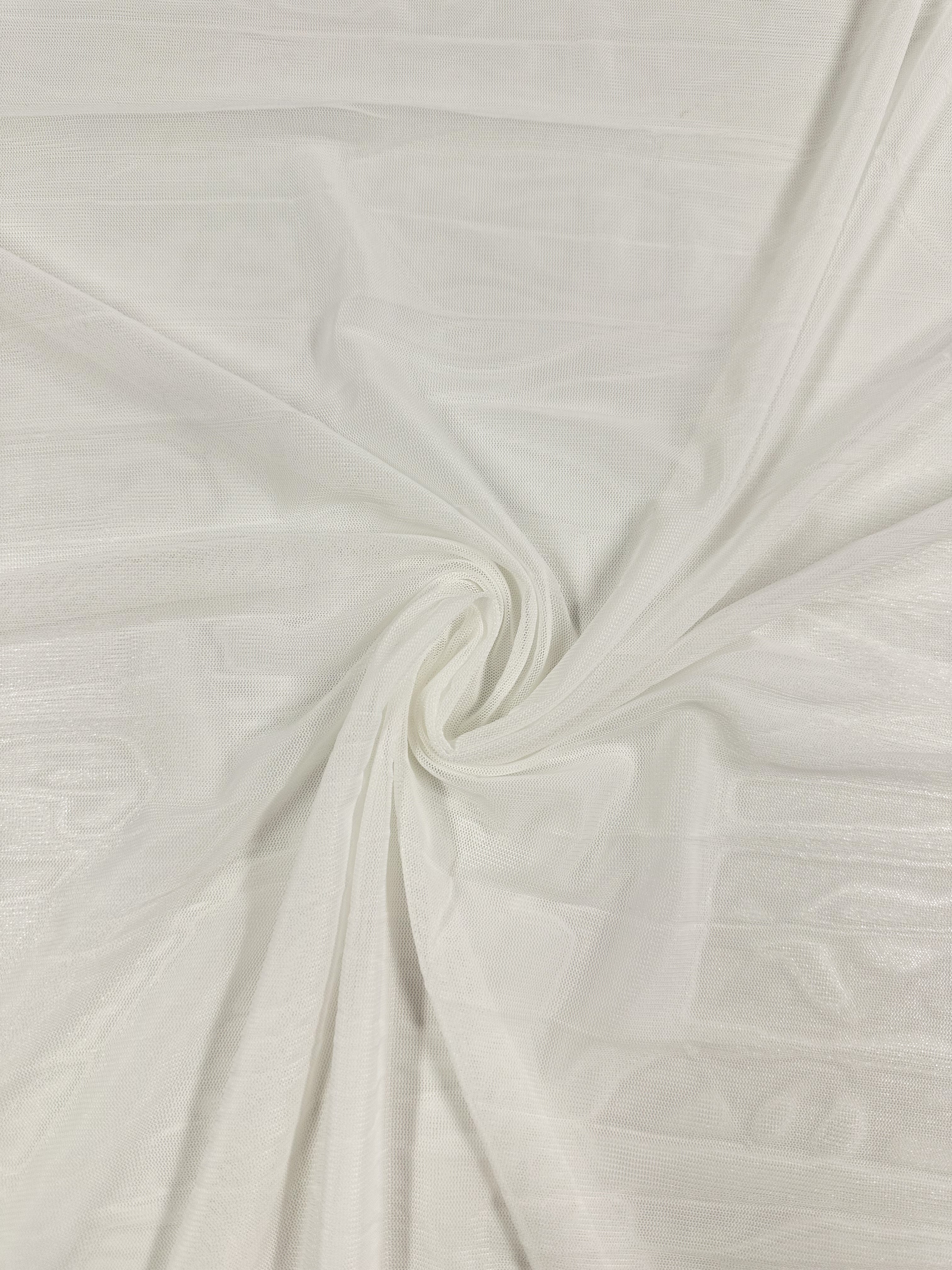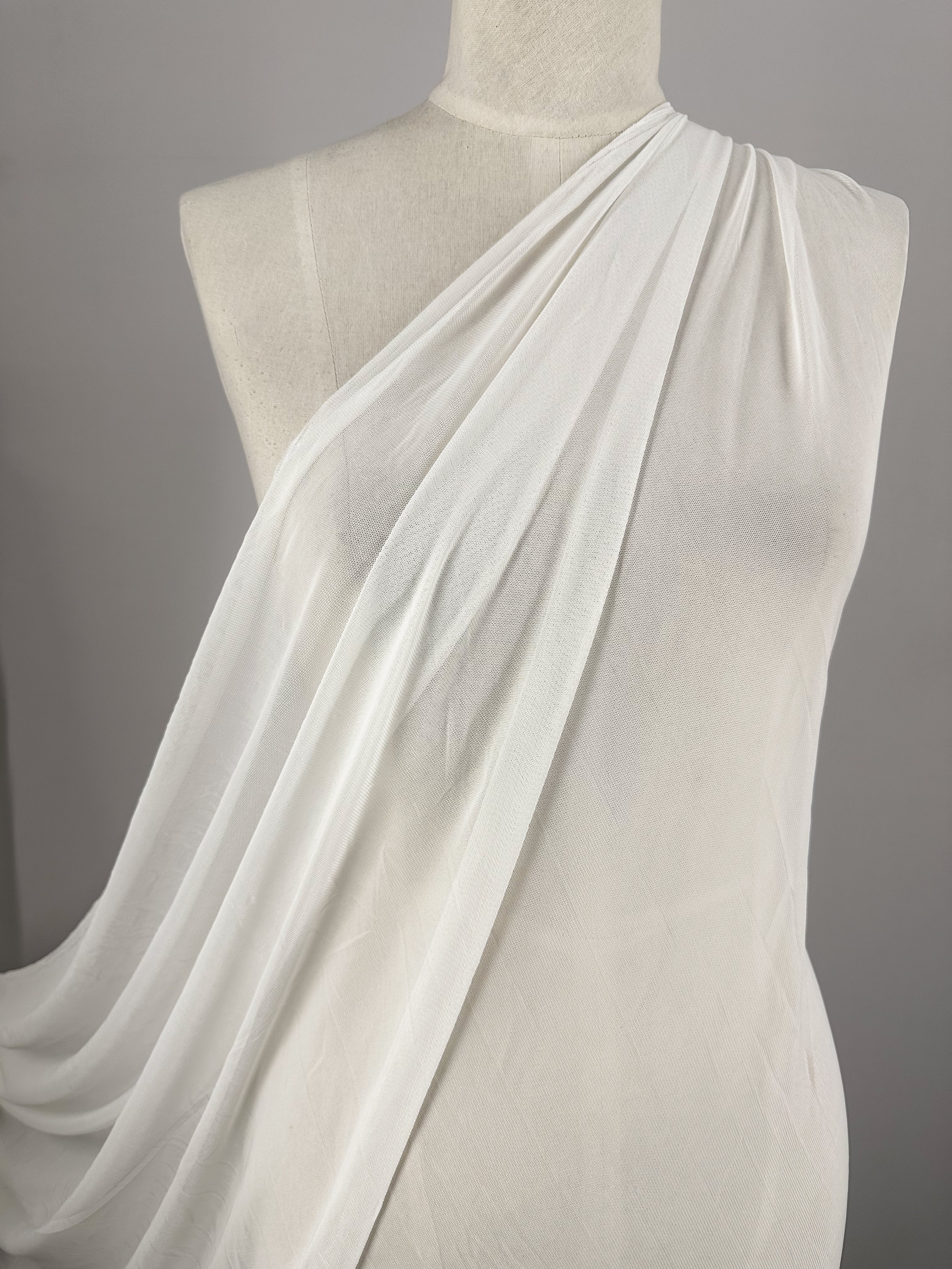 The tailor's mannequin is elegantly draped with Super Cheap Fabrics' Plain Mesh - Ivory - 145cm, a lightweight polyester fabric that hangs smoothly, highlighting its soft texture and delicate folds against the neutral background.