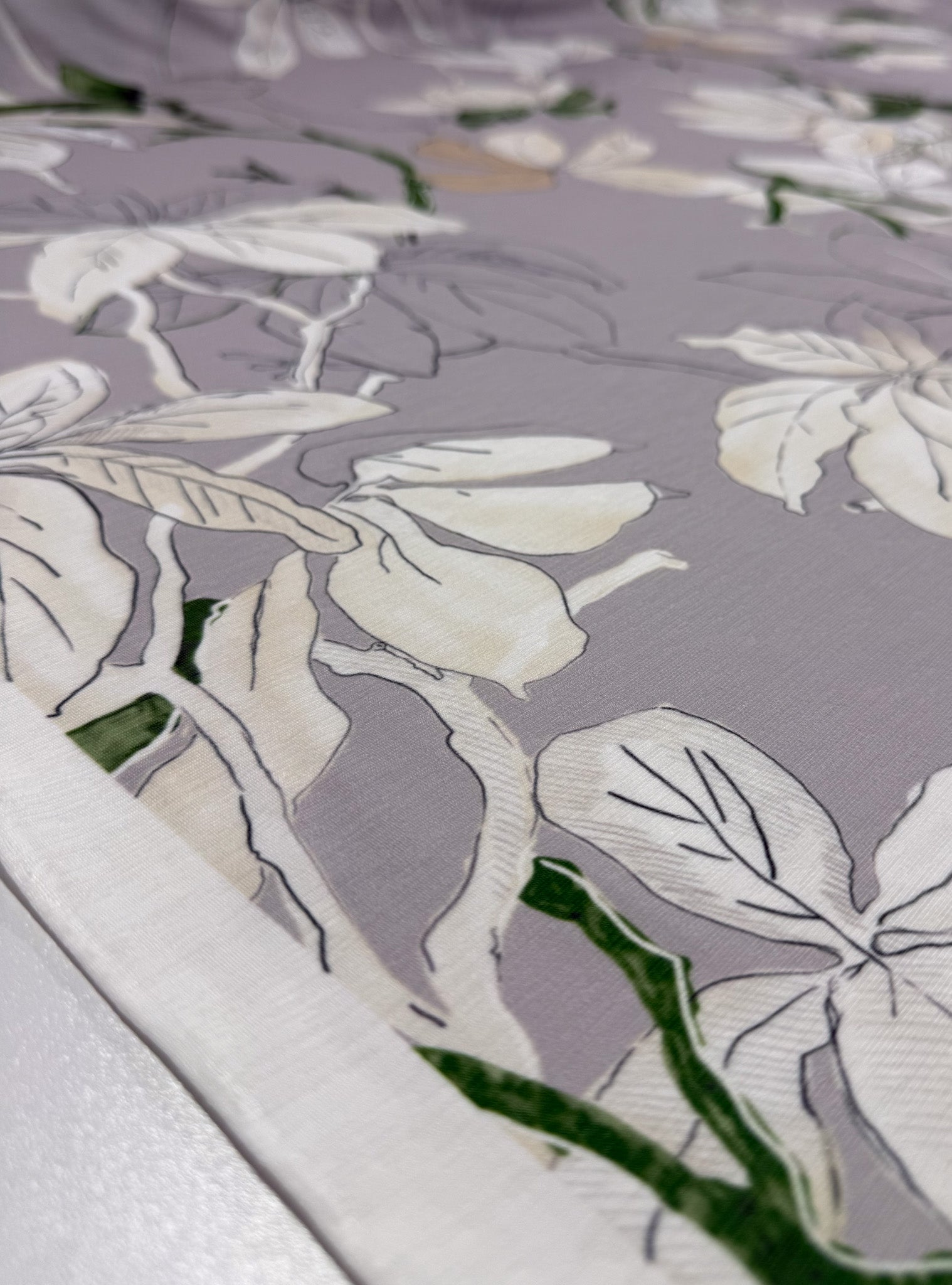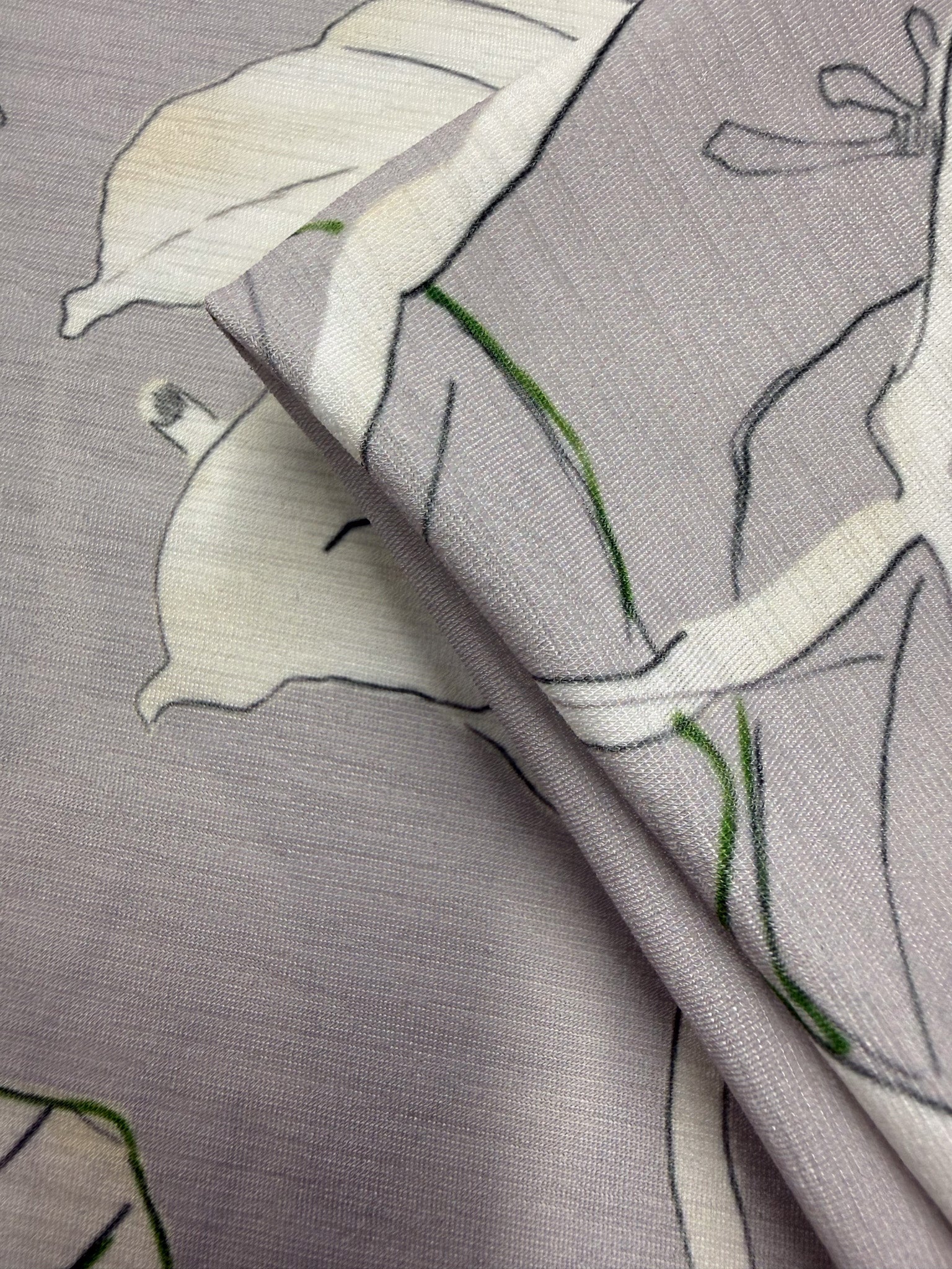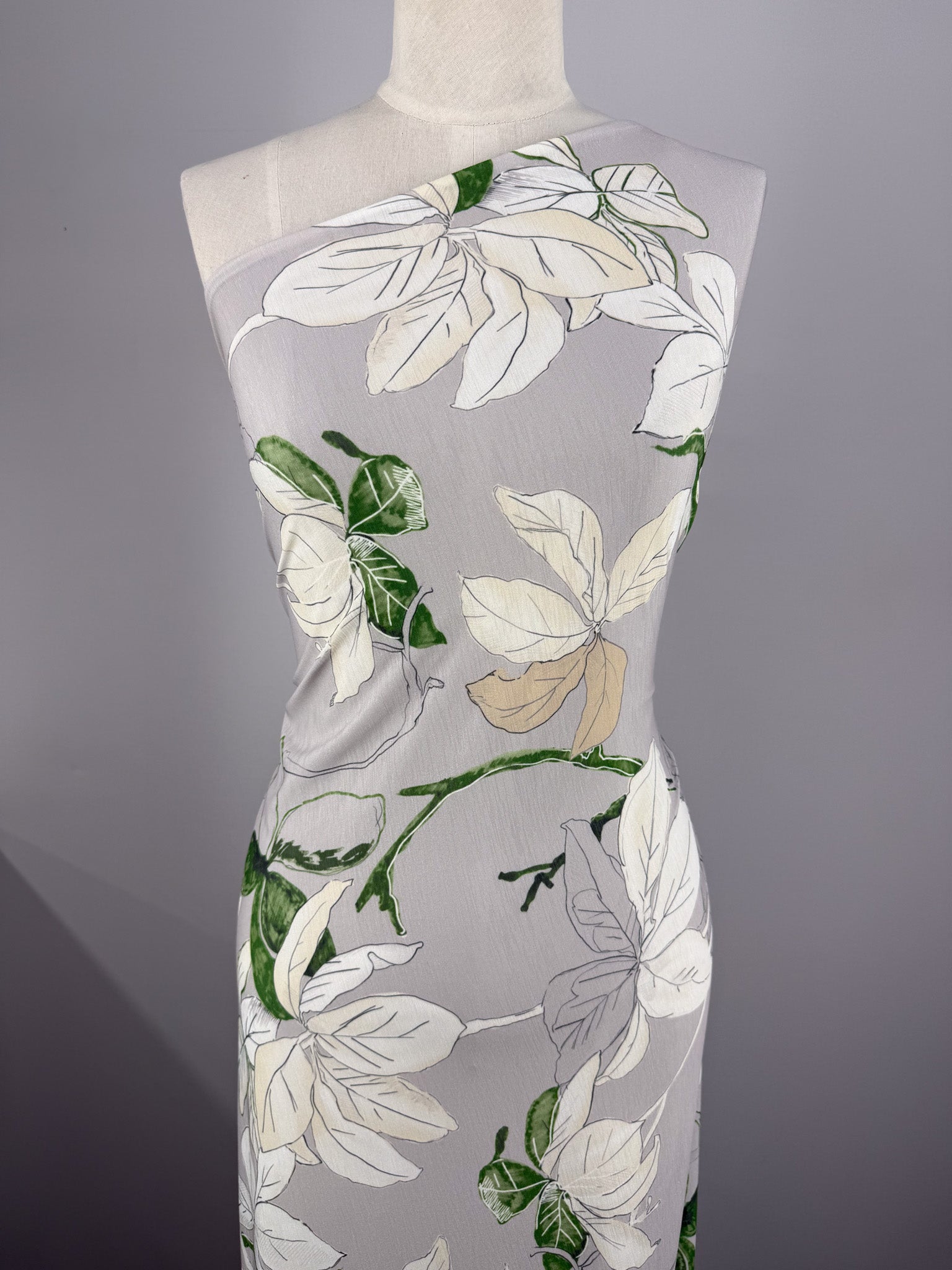 Our Printed Lycra is a Polyester/Spandex fabric that has a two-way stretch and comes in a variety of beautiful prints! Printed Lycra is a medium-weight fabric, has good durability and stretch, and washes well. Our Lycras are perfect for making tops, dresses, skirts, pants, accessories, and even childrenswear. This print features a large-scale botanical design with an elegant, airy feel.