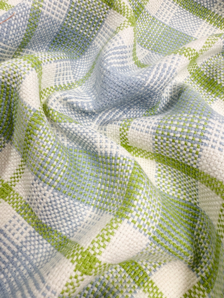 A textured weave pure linen in crisp green and blue. A fresh lime & blue linen check.