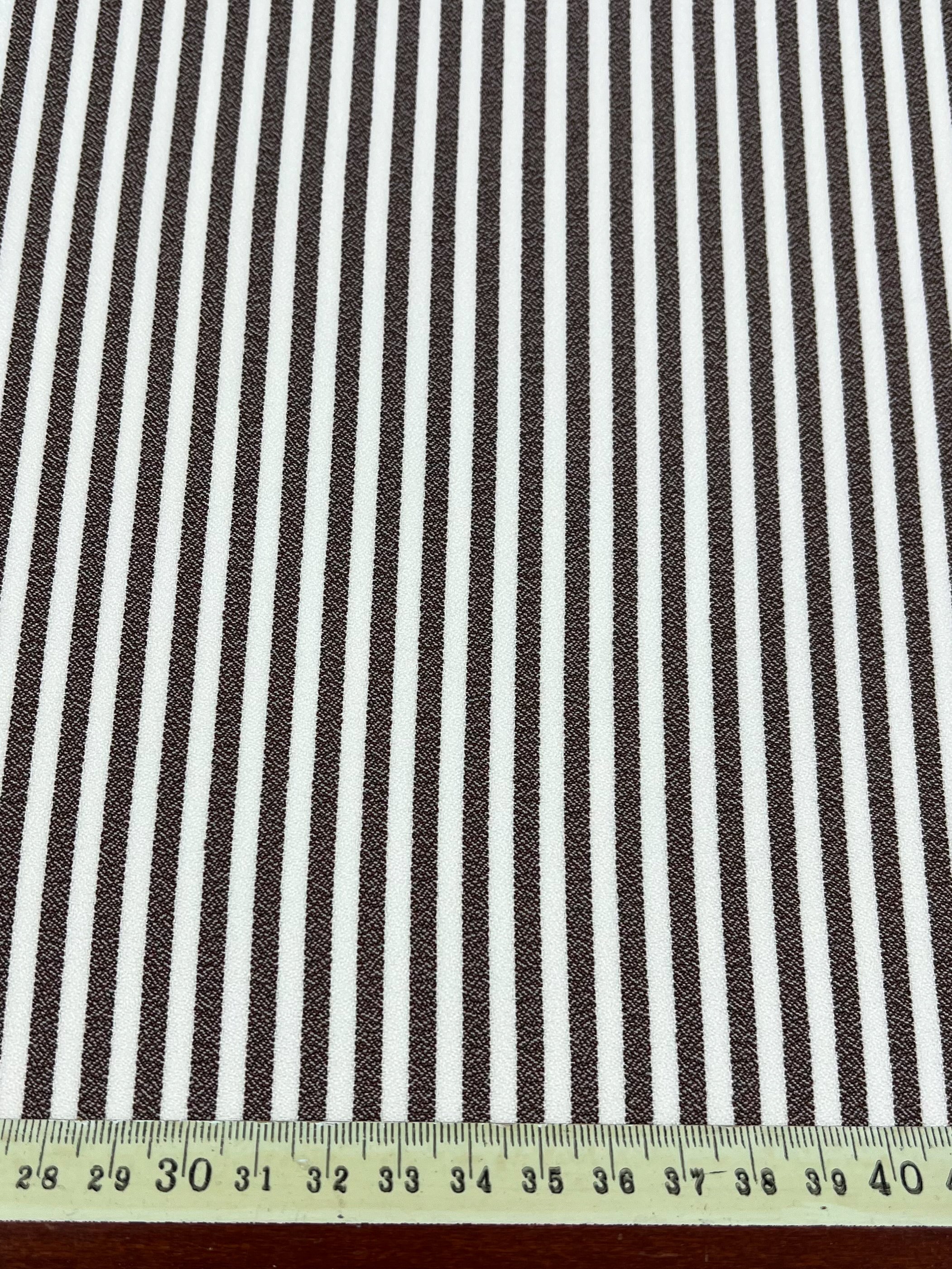 Close-up of Striped Crepe - Fondue Fudge by Super Cheap Fabrics, 150cm wide. Lightweight polyester with brown and white vertical stripes and textured surface, perfect for chic eveningwear.