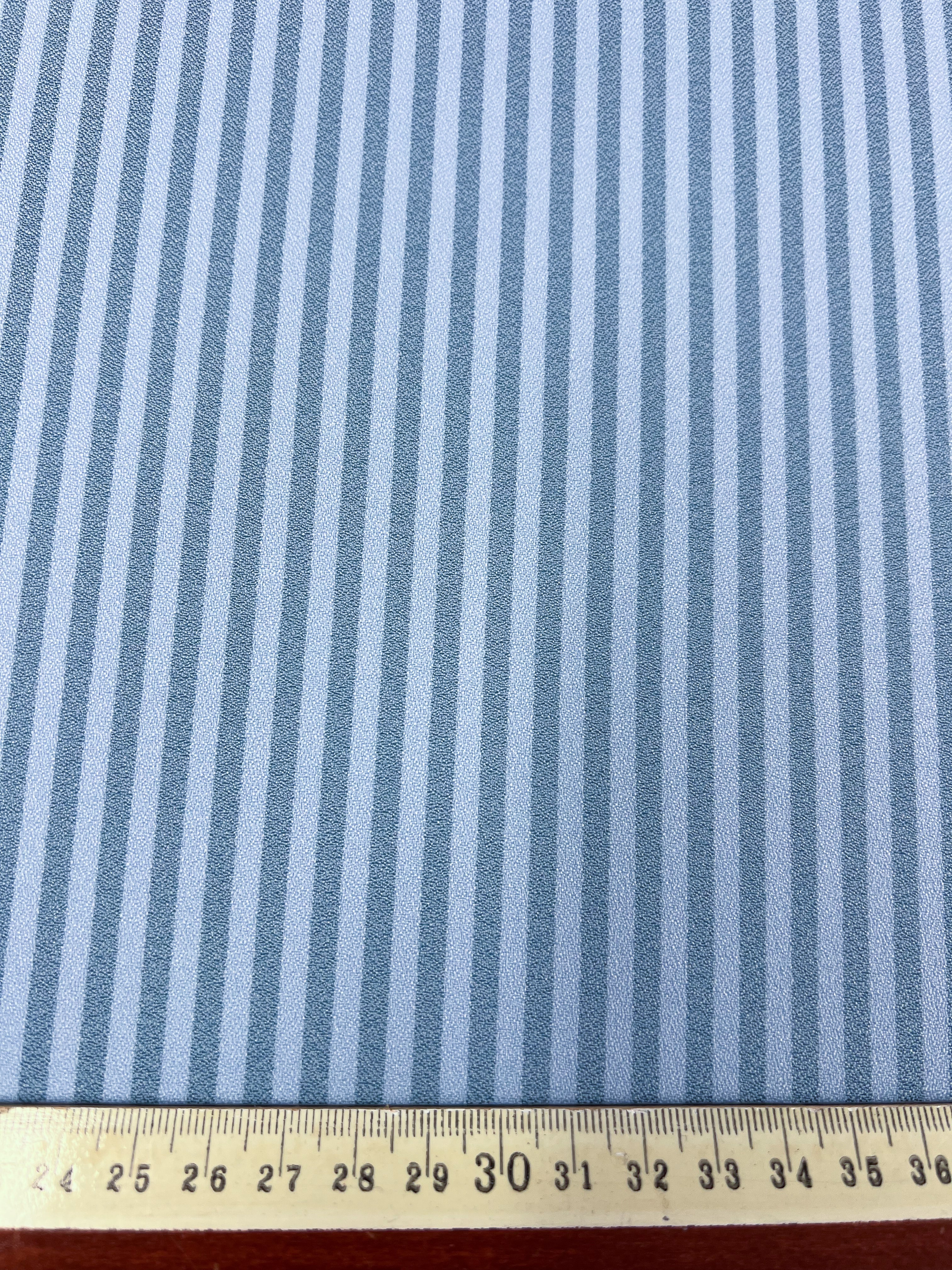 The "Striped Crepe - Milky Blue - 150cm" by Super Cheap Fabrics showcases a neatly folded polyester fabric in a milky blue hue, featuring alternating light and dark blue stripes that form a textured pattern. This smooth and soft fabric exudes high fashion and is an ideal option for clothing or home textiles.
