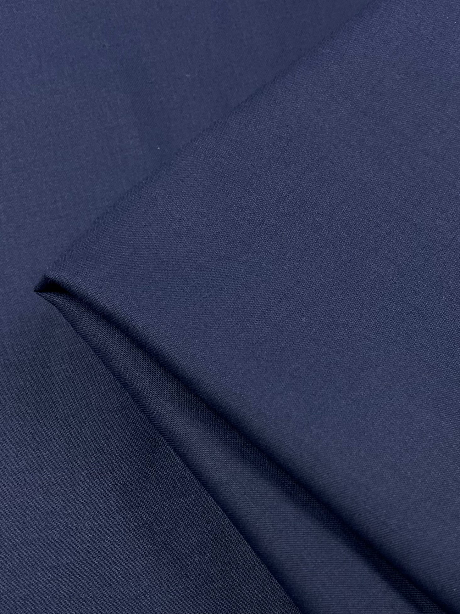A close-up of folded **Superfine Suiting - Navy - 150cm** by **Super Cheap Fabrics** in a wool polyester blend. The texture appears smooth and tightly woven, with the light creating subtle variations in the shade of blue. The fabric is neatly arranged, showcasing its clean lines and deep color.