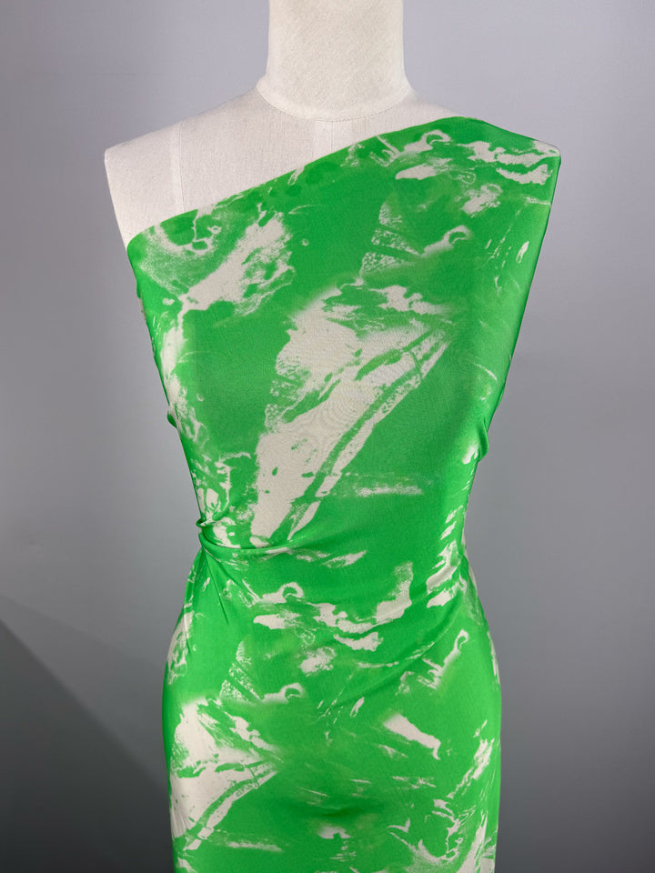 A vibrant green printed viscose knit with a washed marbled look.