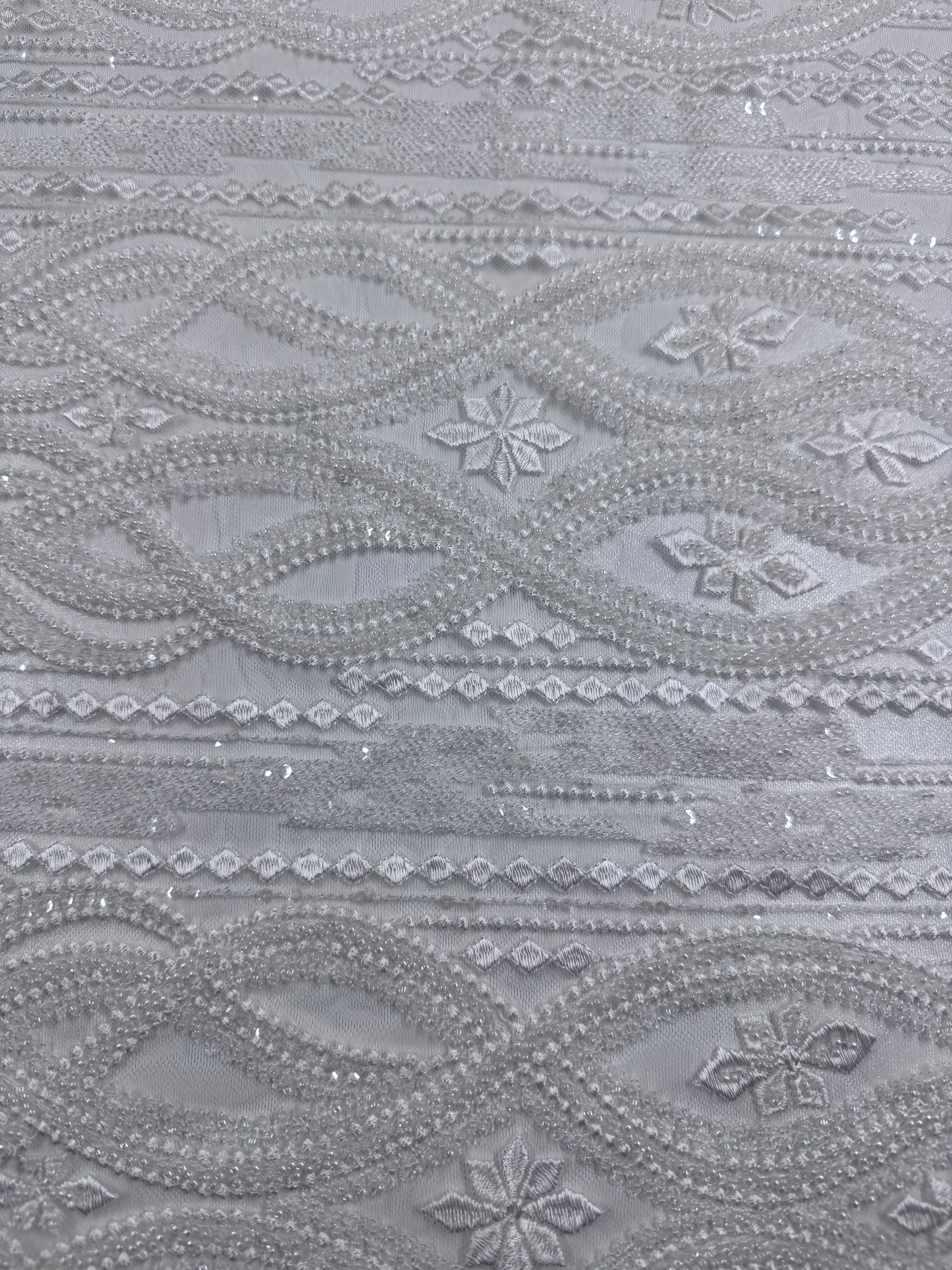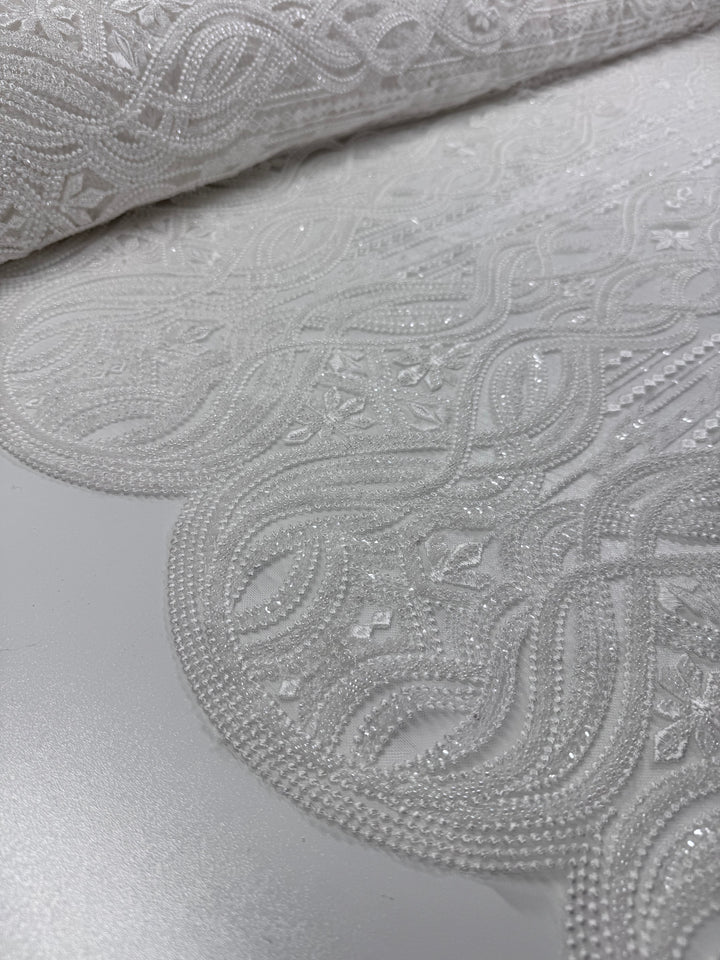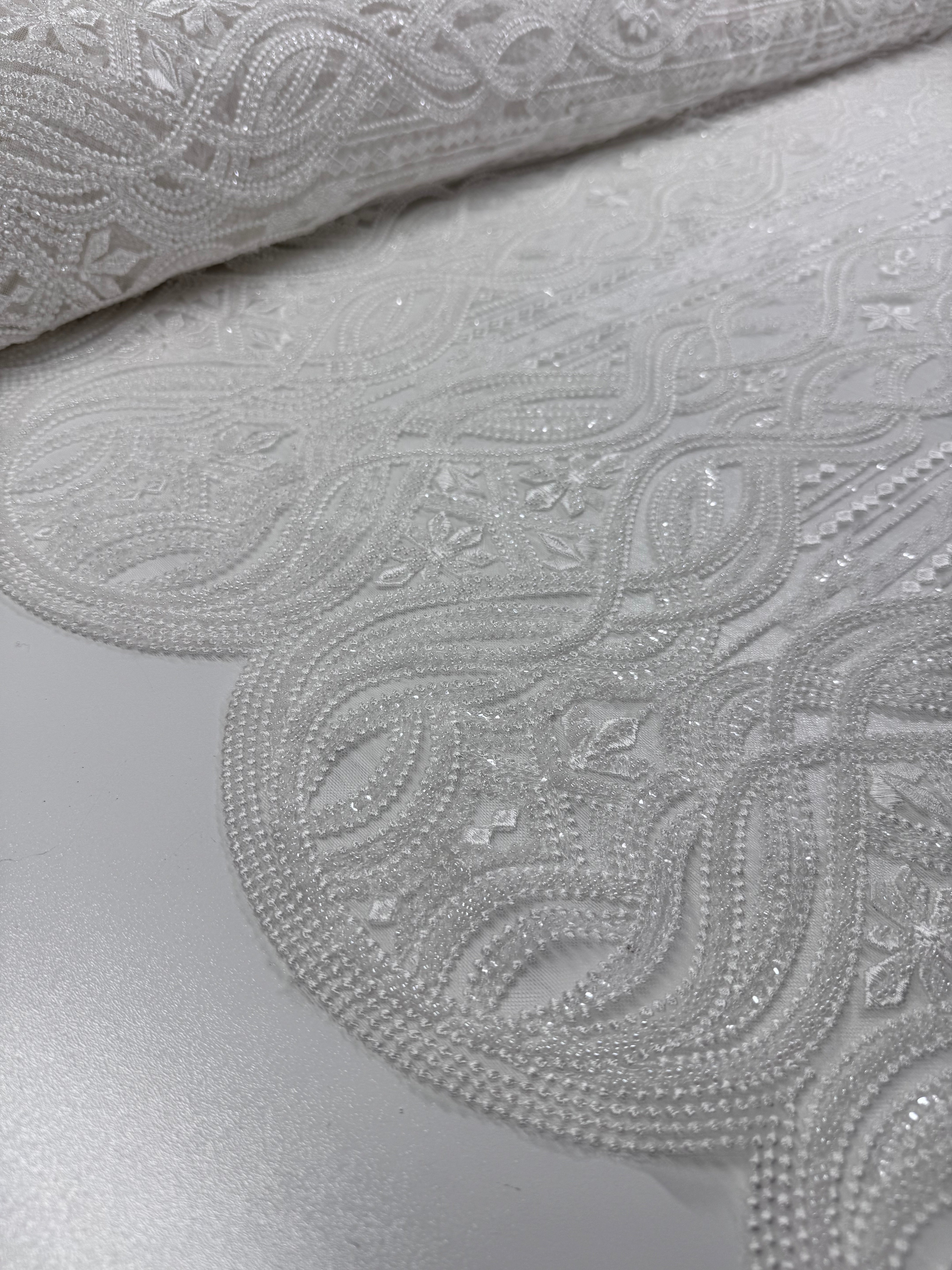 Beaded fabrics are versatile and widely used in various applications. They are commonly found in bridal wear, clothing, home décor, accessories, costumes, bridal veils and lingerie. Lace adds elegance, femininity, and a touch of romance to any item it adorns, making it a popular choice for formal wear, bridal wear and special occasions.