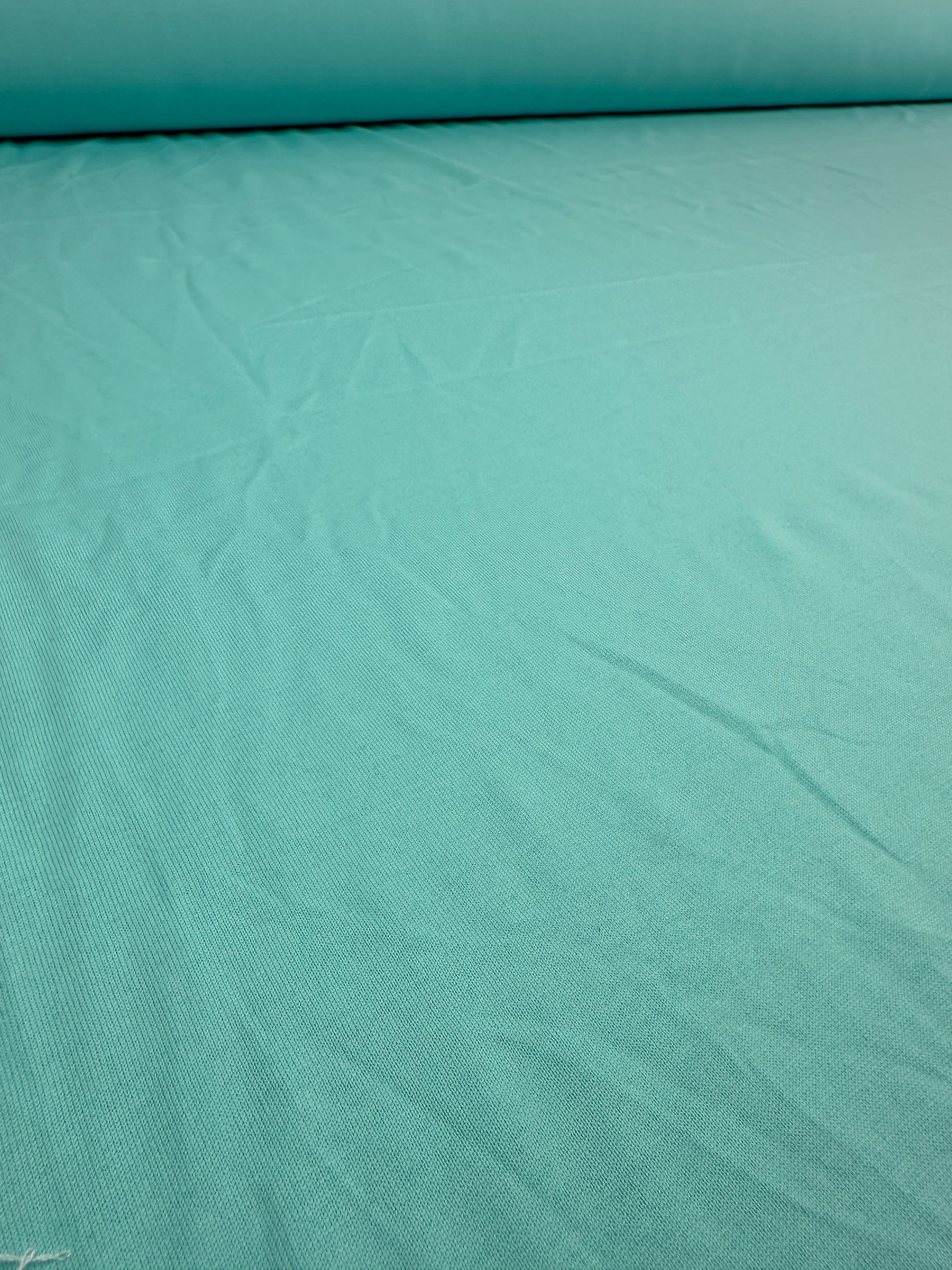 A close-up of Super Cheap Fabrics' Cotton Jersey in Aqua Splash, 160cm wide, reveals its smooth turquoise surface with subtle wrinkles and texture.