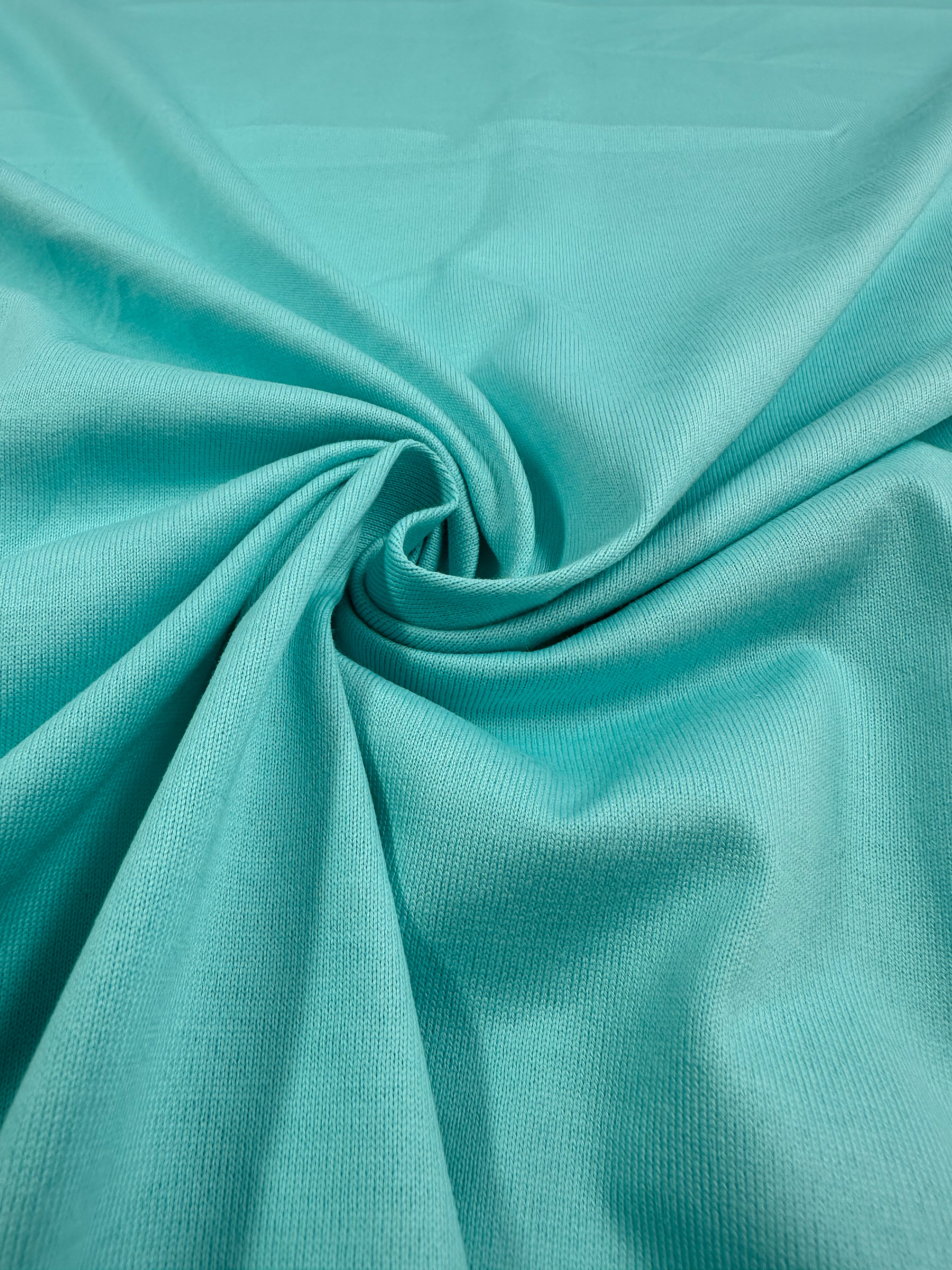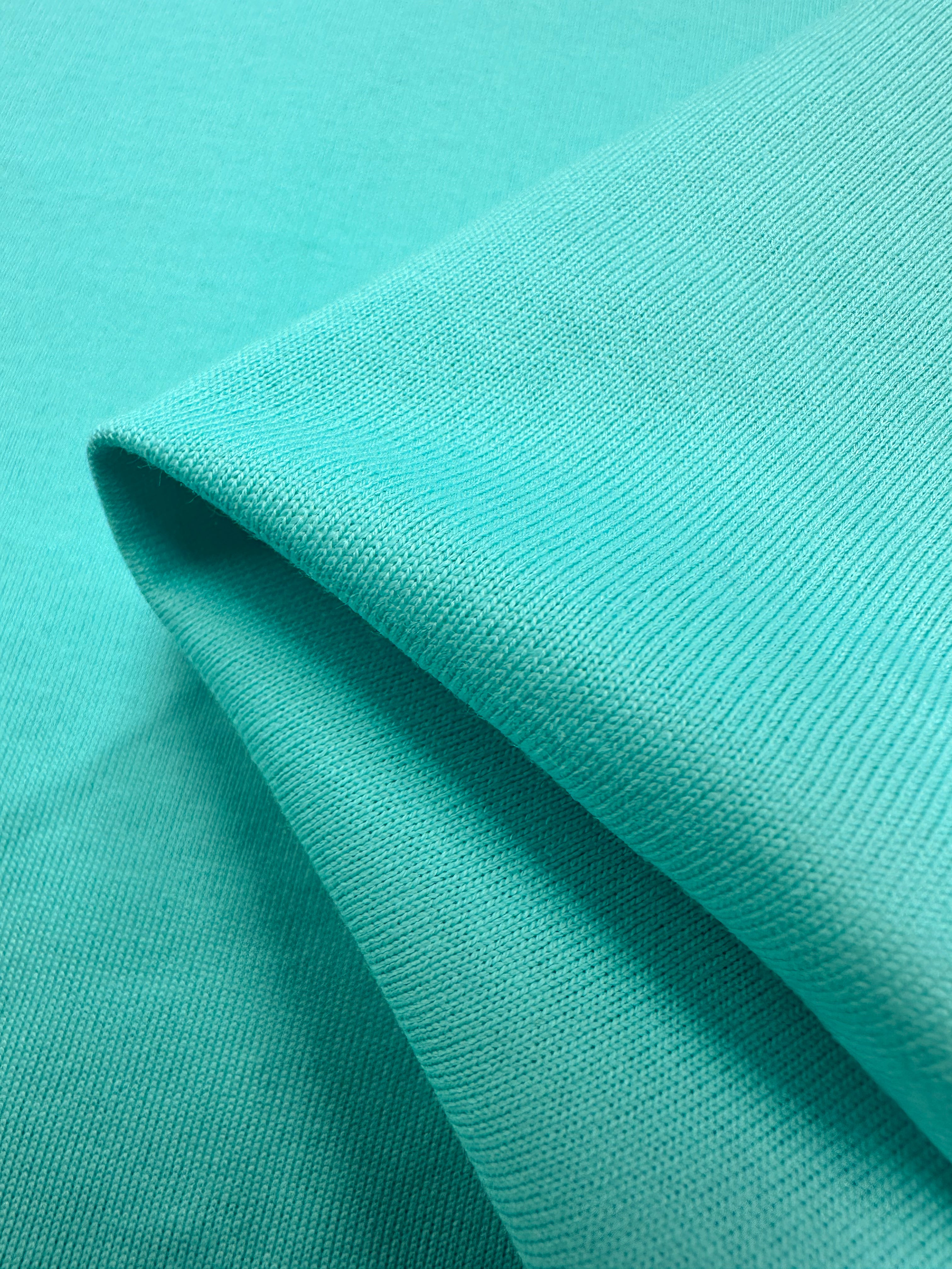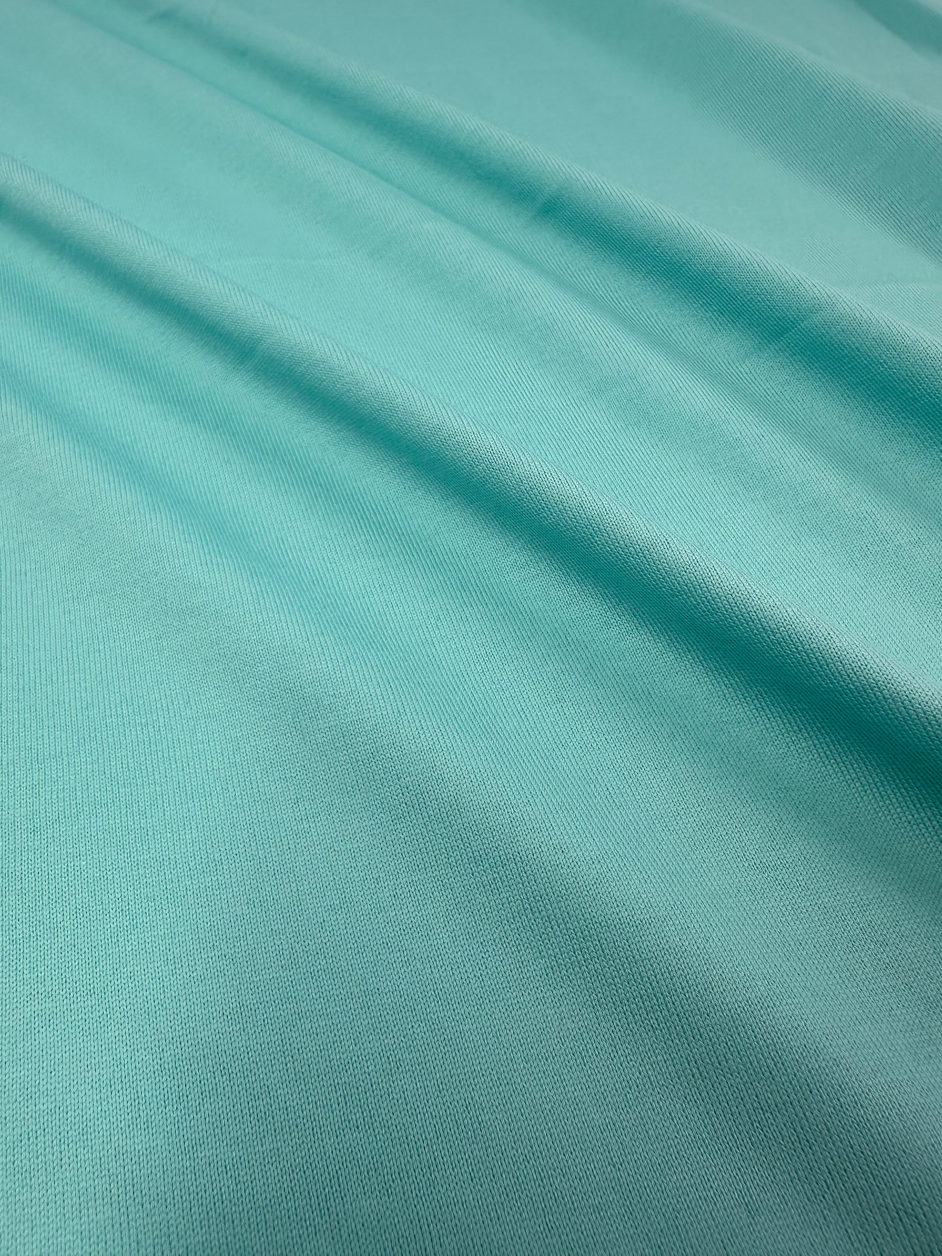 A close-up of Super Cheap Fabrics' Cotton Jersey in Aqua Splash shows its fine ribbed texture and vibrant hue. Its folds cast shadows highlighting the cotton's soft, smooth, and flexible nature.