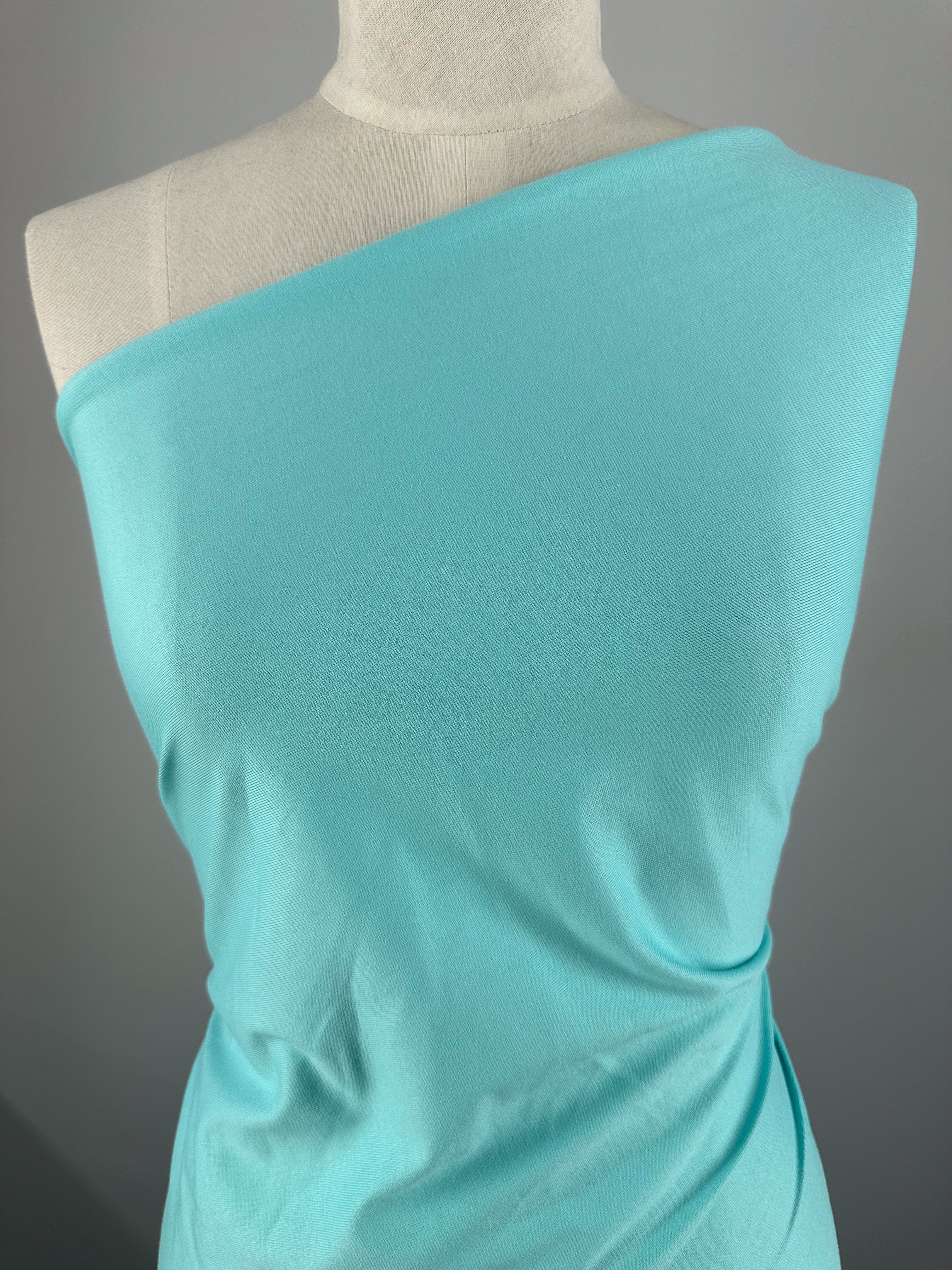A mannequin displays Super Cheap Fabrics' Cotton Jersey in Aqua Splash - 160cm, elegantly draped to create gentle folds. The fabric cascades from one shoulder against a plain grey background, highlighting its soft allure.
