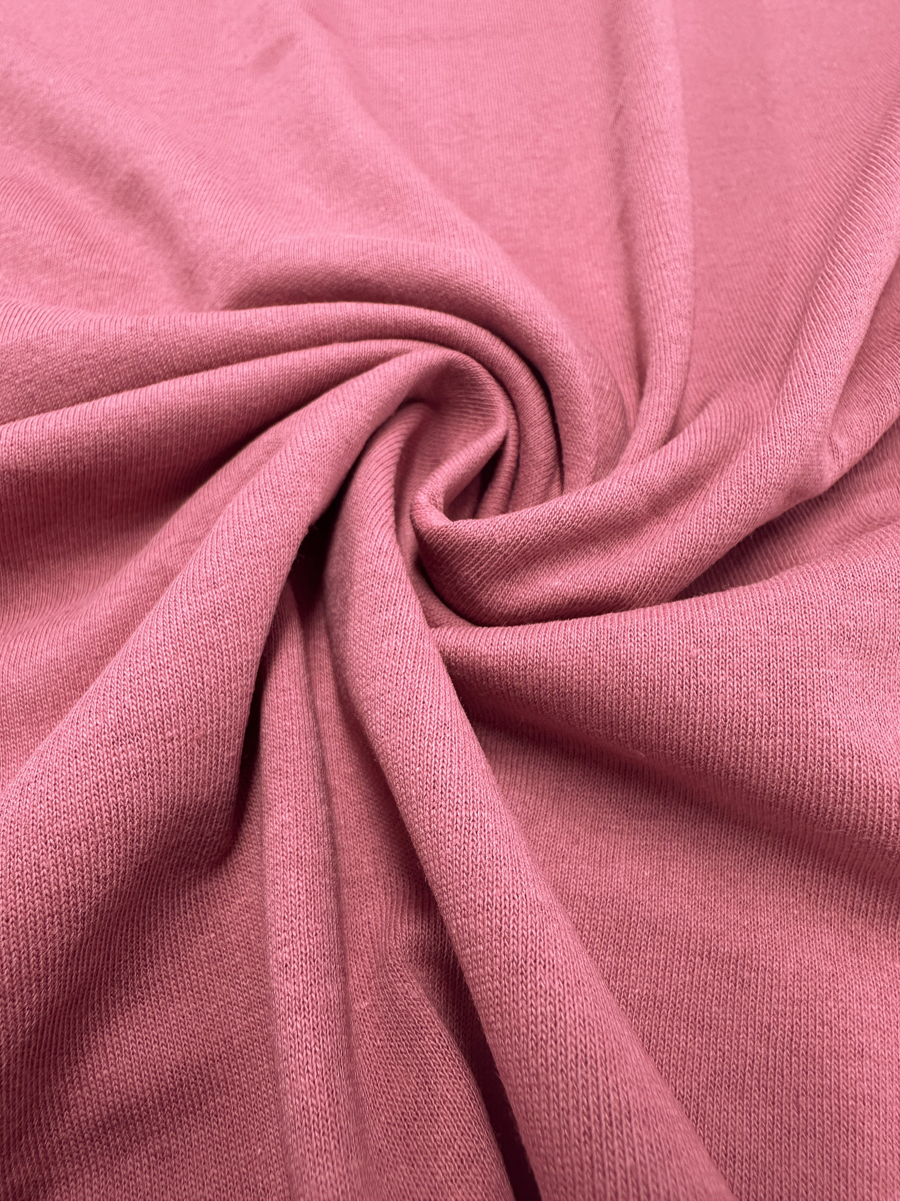 Close-up of Super Cheap Fabrics Cotton Jersey in Slate Rose, 175cm width, featuring a pink fabric with a smooth, softly ribbed texture and gathered into a spiral pattern that creates gentle folds and shadows.