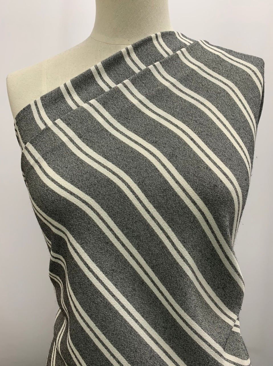 A mannequin is draped with a medium-weight fabric featuring white diagonal stripes on a gray background. This Super Cheap Fabrics blend, Crepe - Zoe Stripe - White, covers one shoulder and angles across the torso, showcasing its texture and pattern against a plain backdrop.