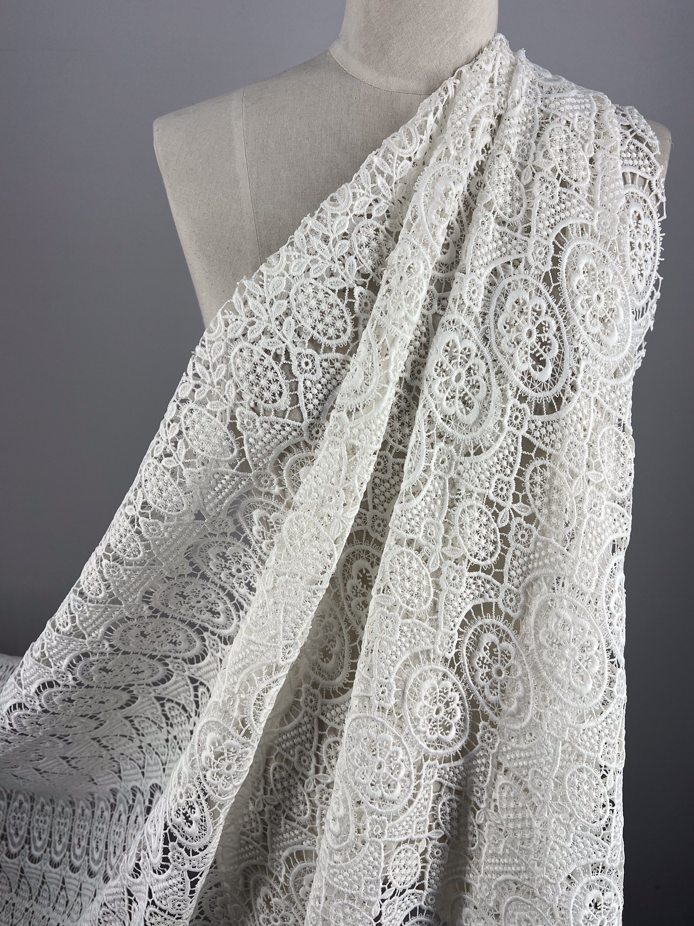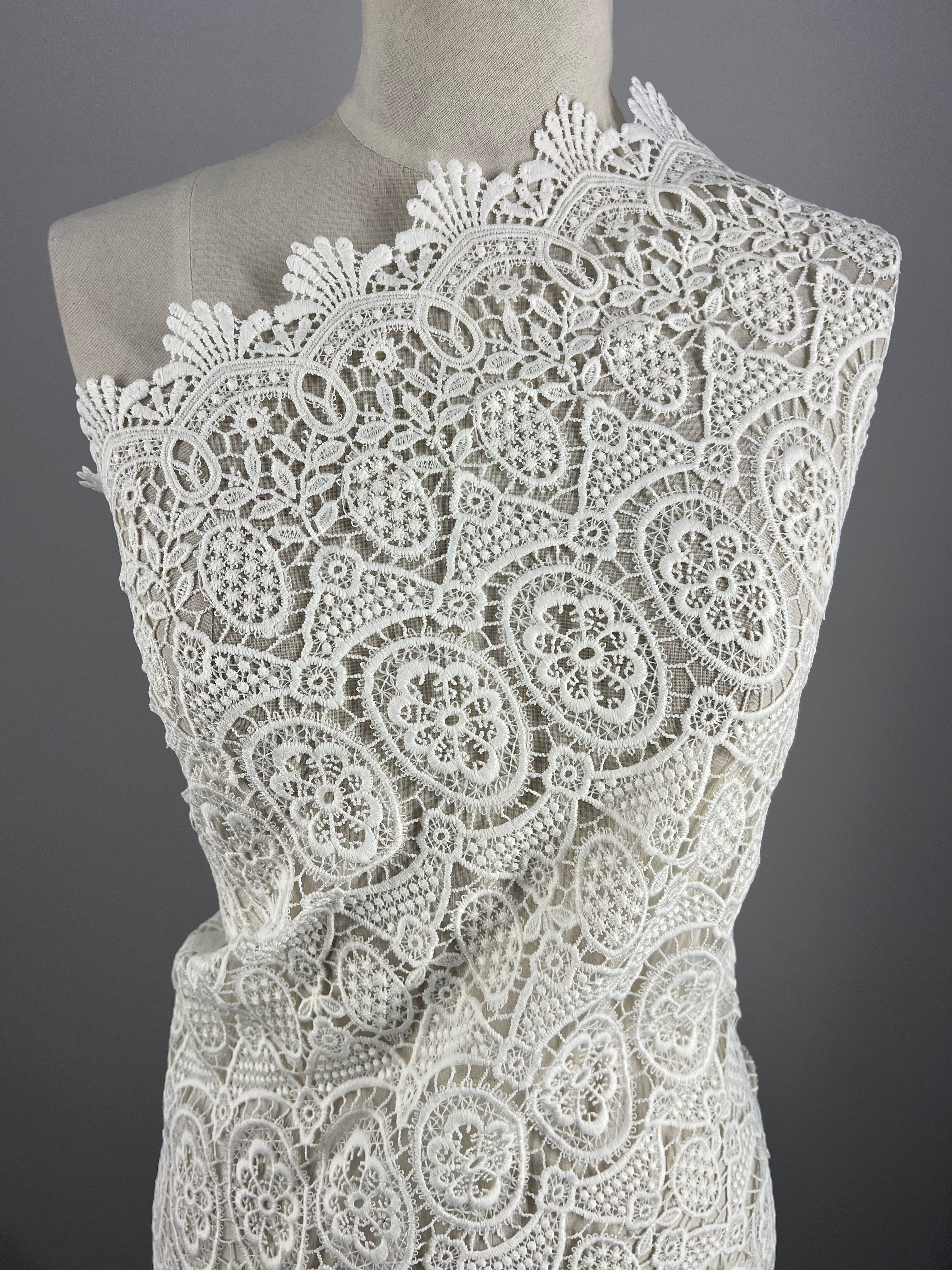 Close-up of an intricate lace fabric with a delicate, detailed pattern featuring floral and geometric designs. The ivory fabric is 116 CM wide and has a soft, elegant texture. The edges have a scalloped, lace trim made from high-quality polyester. This is the Designer Anglaise Lace - Guipure - 116cm by Super Cheap Fabrics.