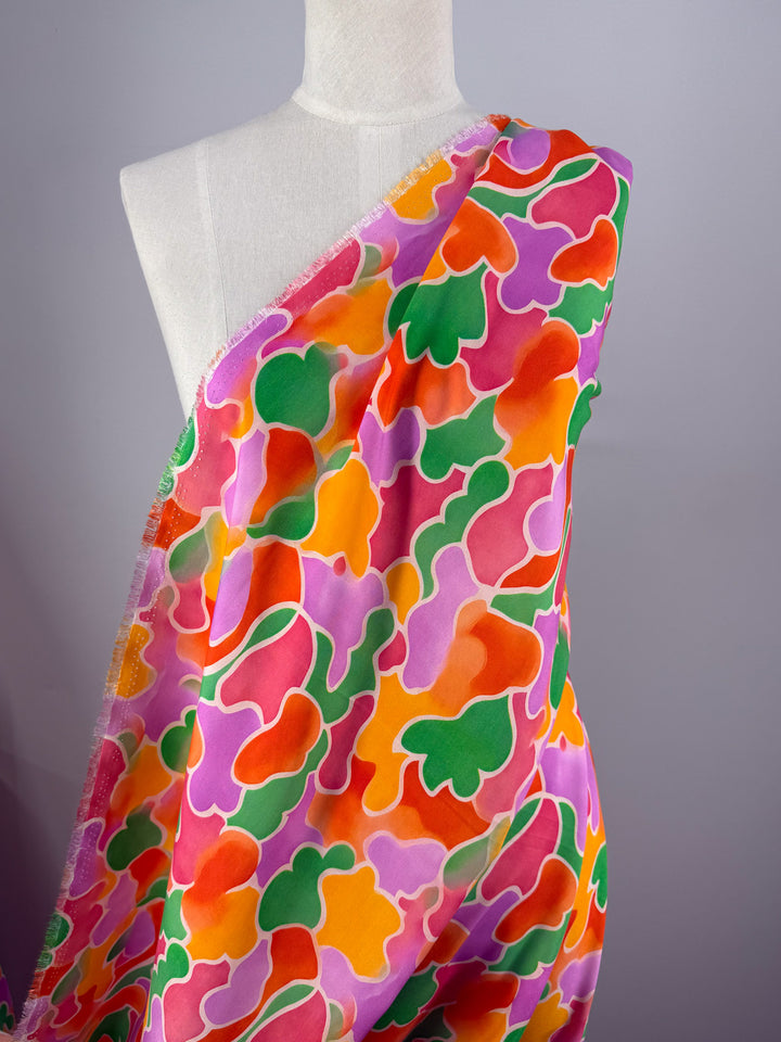 Our Designer Rayon showcases a beautiful and colourful fabric with vibrant prints that can be used for various purposes such as dresses, skirts, blouses, curtains, and more. Our collection showcases a soft, lightweight fabric with a smooth drape and a luxurious feel. Overall, rayon fabric offers both comfort and style, making it a versatile choice for any project. Fiesta Cloud bursts with playful abstract shapes in shades of lilac, tangerine, rose, and leafy green, each outlined in white for a soft painterly effect.