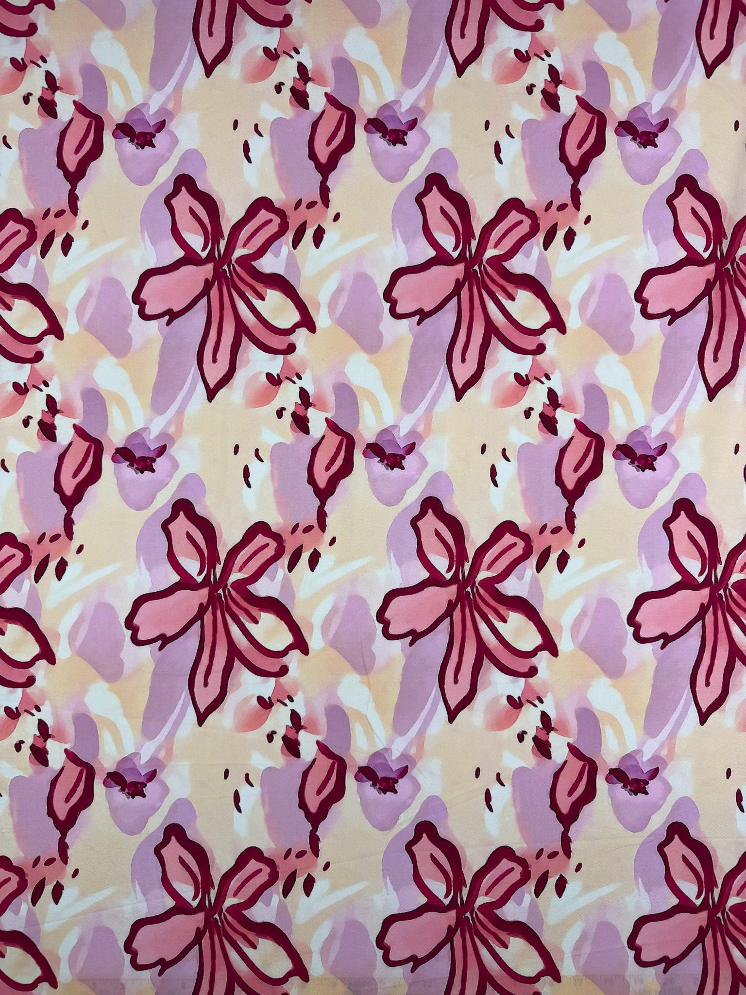 Our Designer Rayon showcases a beautiful and colourful fabric with vibrant prints that can be used for various purposes such as dresses, skirts, blouses, curtains, and more. Our collection showcases a soft, lightweight fabric with a smooth drape and a luxurious feel. Overall, rayon fabric offers both comfort and style, making it a versatile choice for any project. Rosewater features painterly floral motifs in soft blush and lilac tones, outlined in rich raspberry over a gentle cream base.