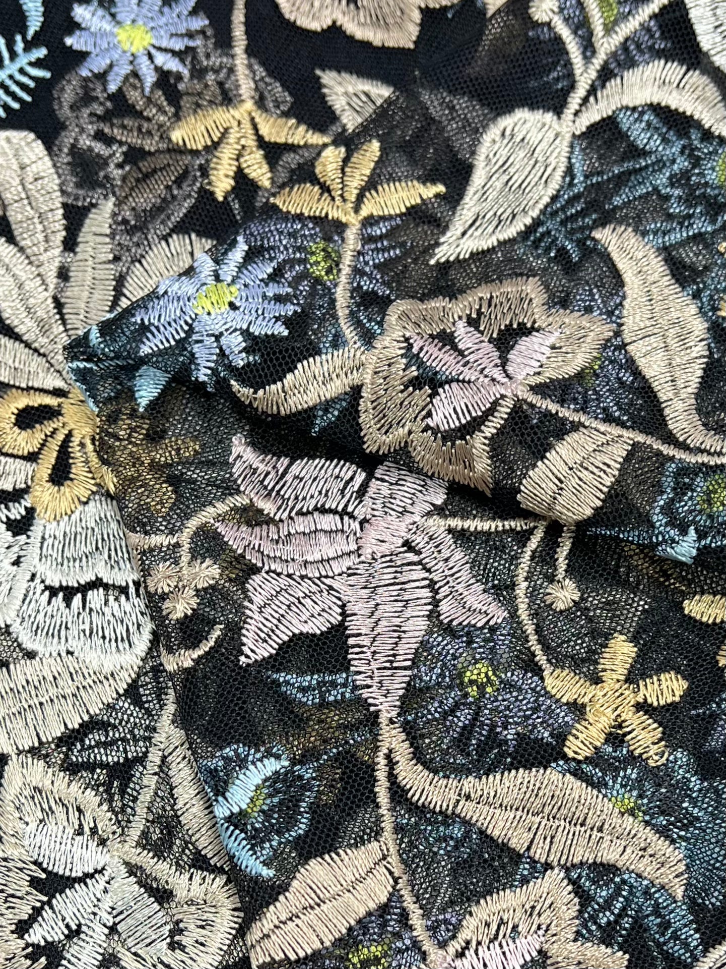A mannequin draped with Embroidered Lace - Dolce - 150cm from Super Cheap Fabrics, a sheer black mesh fabric embroidered with intricate floral patterns in pastel shades of blue, white, and lavender, along with gold and silver accents. The detailed embroidery on the polyester material features various flowers and leaves, creating an elegant design.