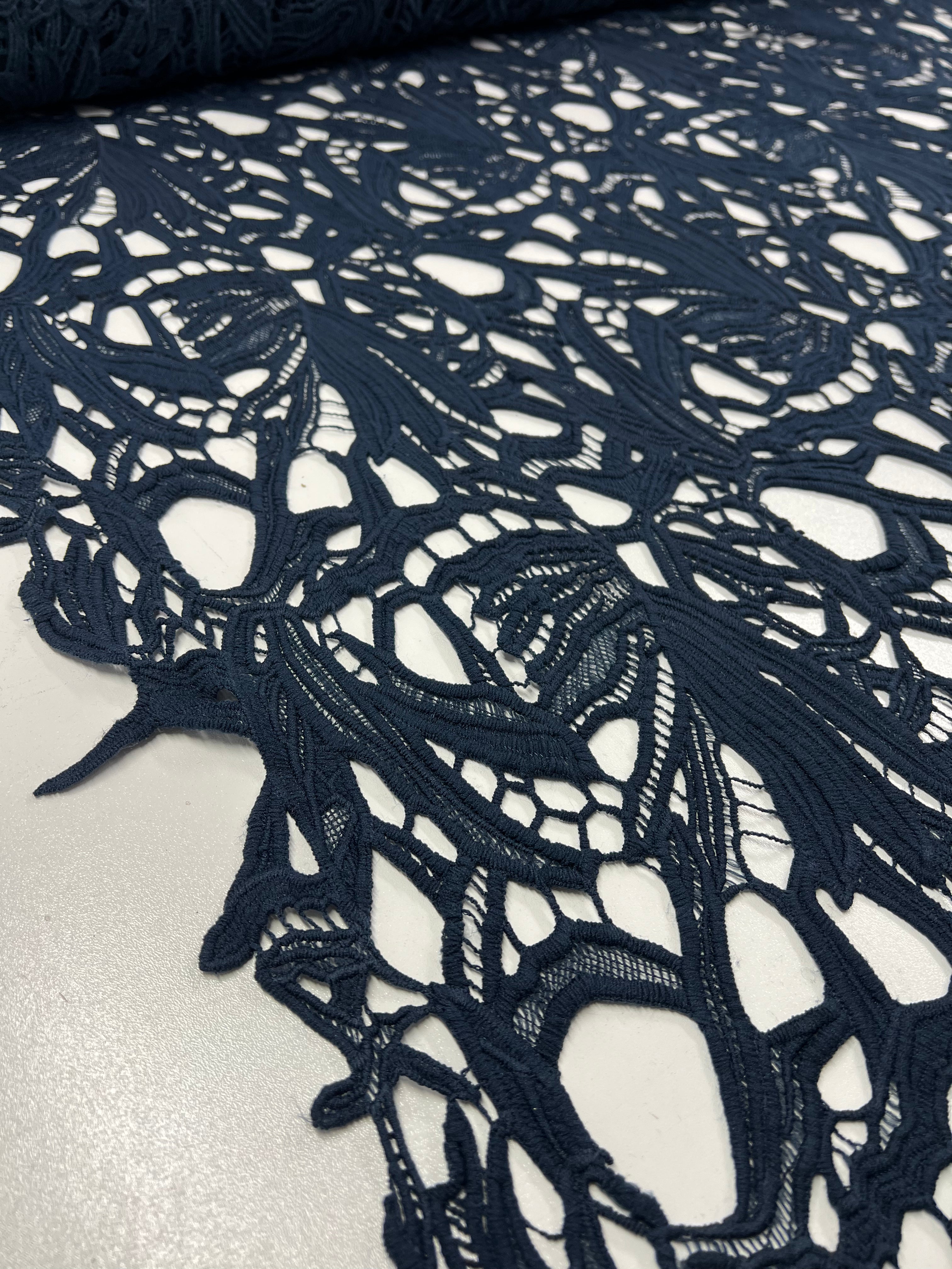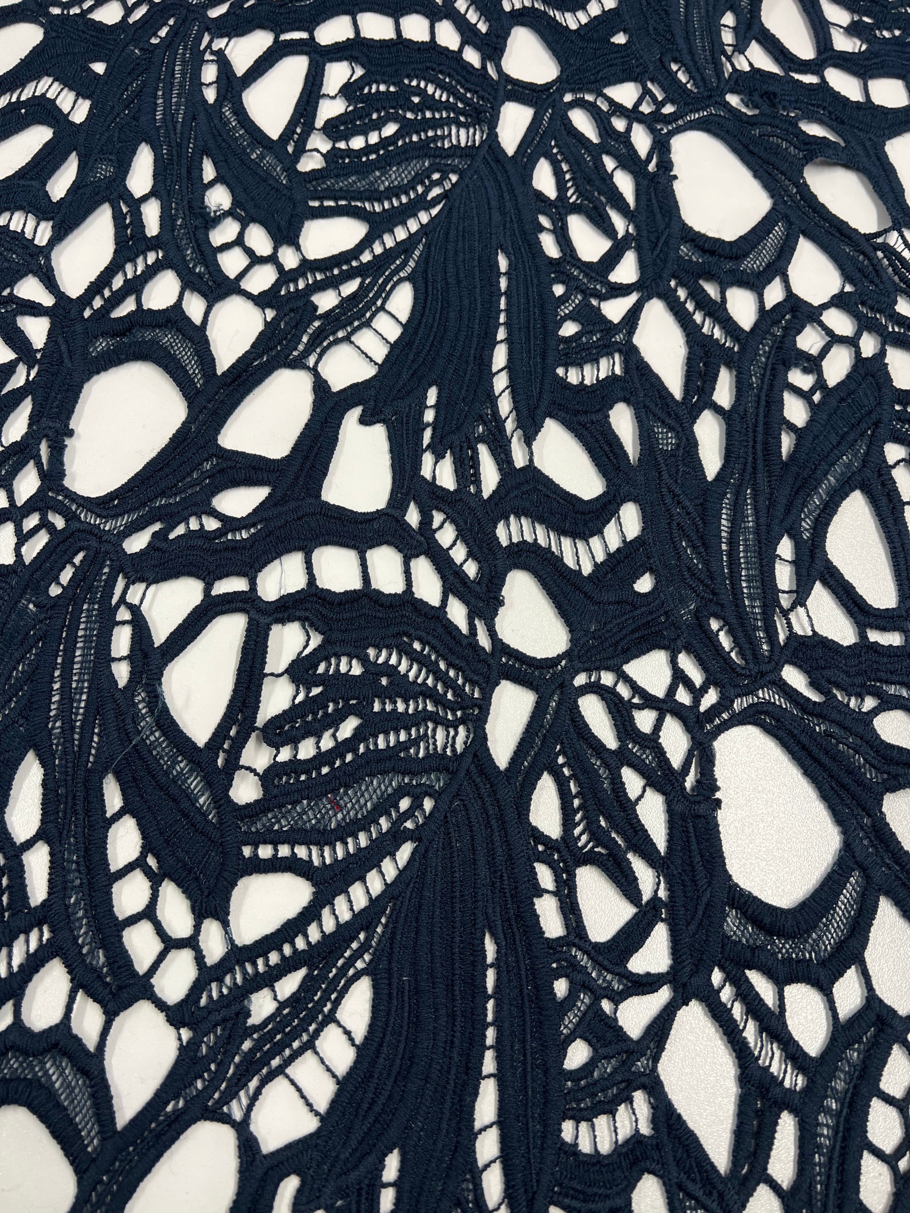 Close-up image of Super Cheap Fabrics' Evening Lace - Navy - 100cm intricate polyester lace fabric with floral and leaf patterns. The lightweight fabric has an open, airy design with solid and sheer material creating a contrast against a white background.