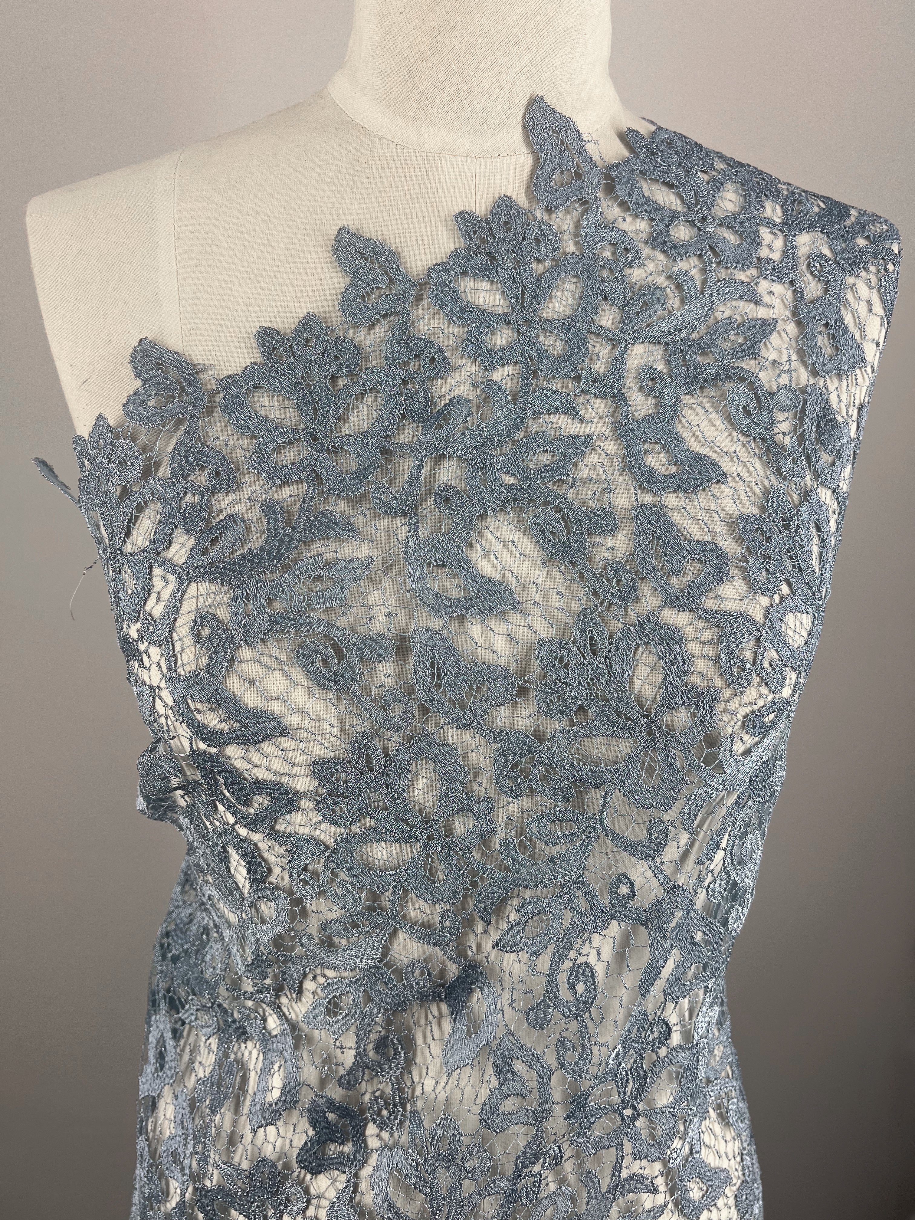 A close-up photo of Super Cheap Fabrics' Evening Lace - Metallic Blue - 120cm draped over a white dress form. The intricate lace pattern features floral designs and delicate details, showcasing the sheer polyester fabric's texture and craftsmanship. The background is a neutral gray.