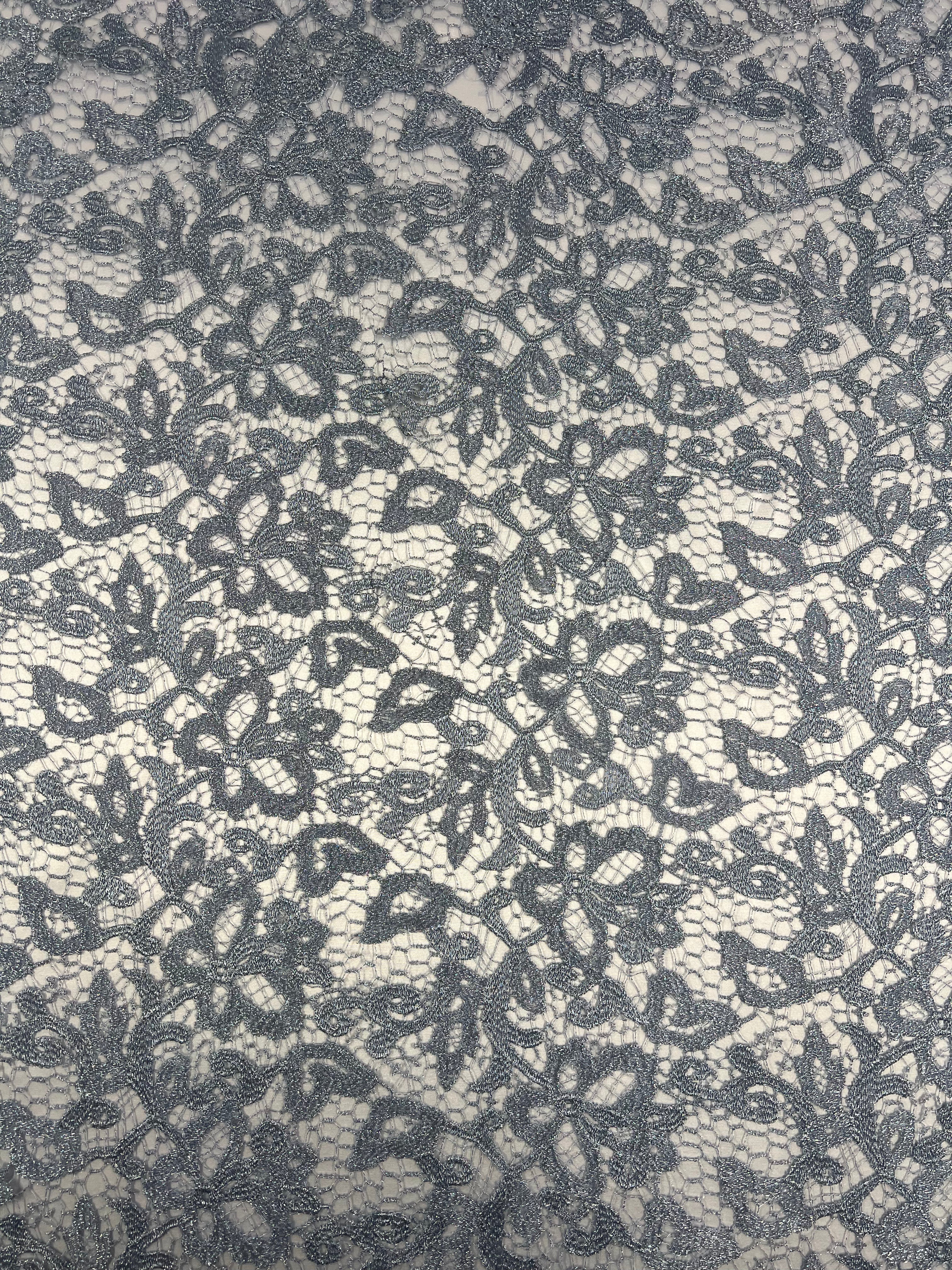 A close-up of Super Cheap Fabrics' Evening Lace - Metallic Blue - 120cm sheer polyester fabric with an intricate lace pattern. The lace features an ornate floral design with leaves and vines woven together, creating an elegant and delicate appearance. The background appears to be a light, neutral color, enhancing the lace details.