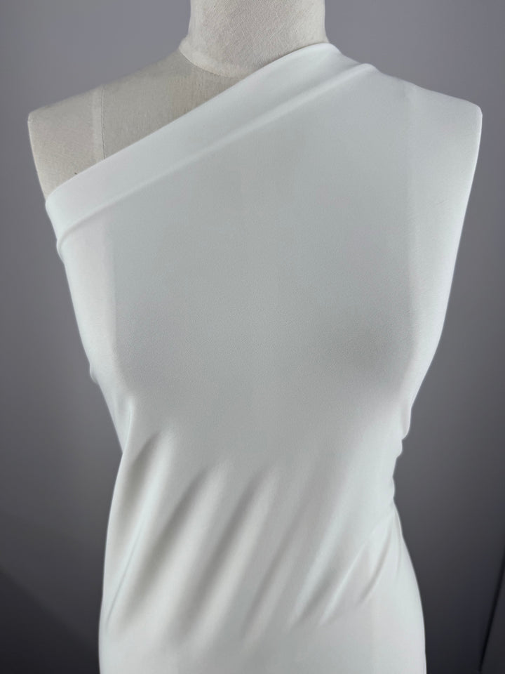 A beautiful plain, ivory-coloured interlock twist yarn fabric. This opaque fabric has been knit to have great elasticity and a soft touch. This medium weight fabric is the perfect weight for tops, dresses skirts and loose pants.