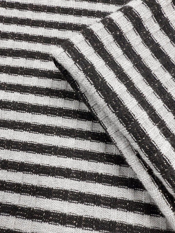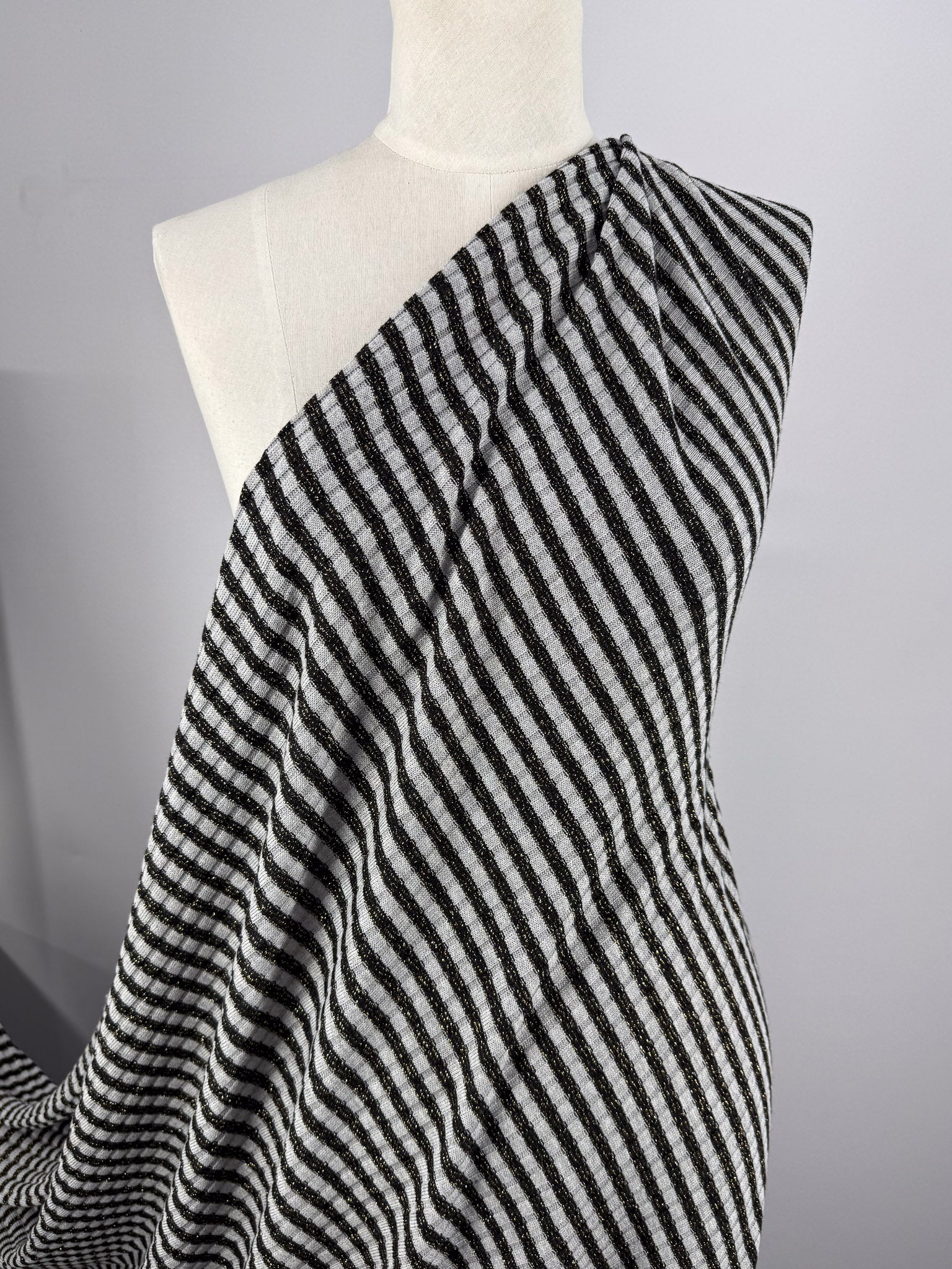 A black and white striped lurex knit fabric with fine metallic (lurex) threading.