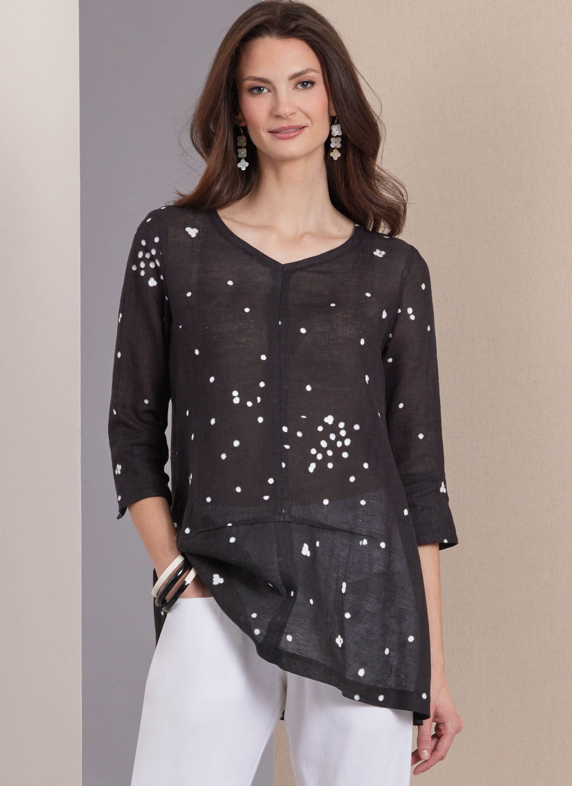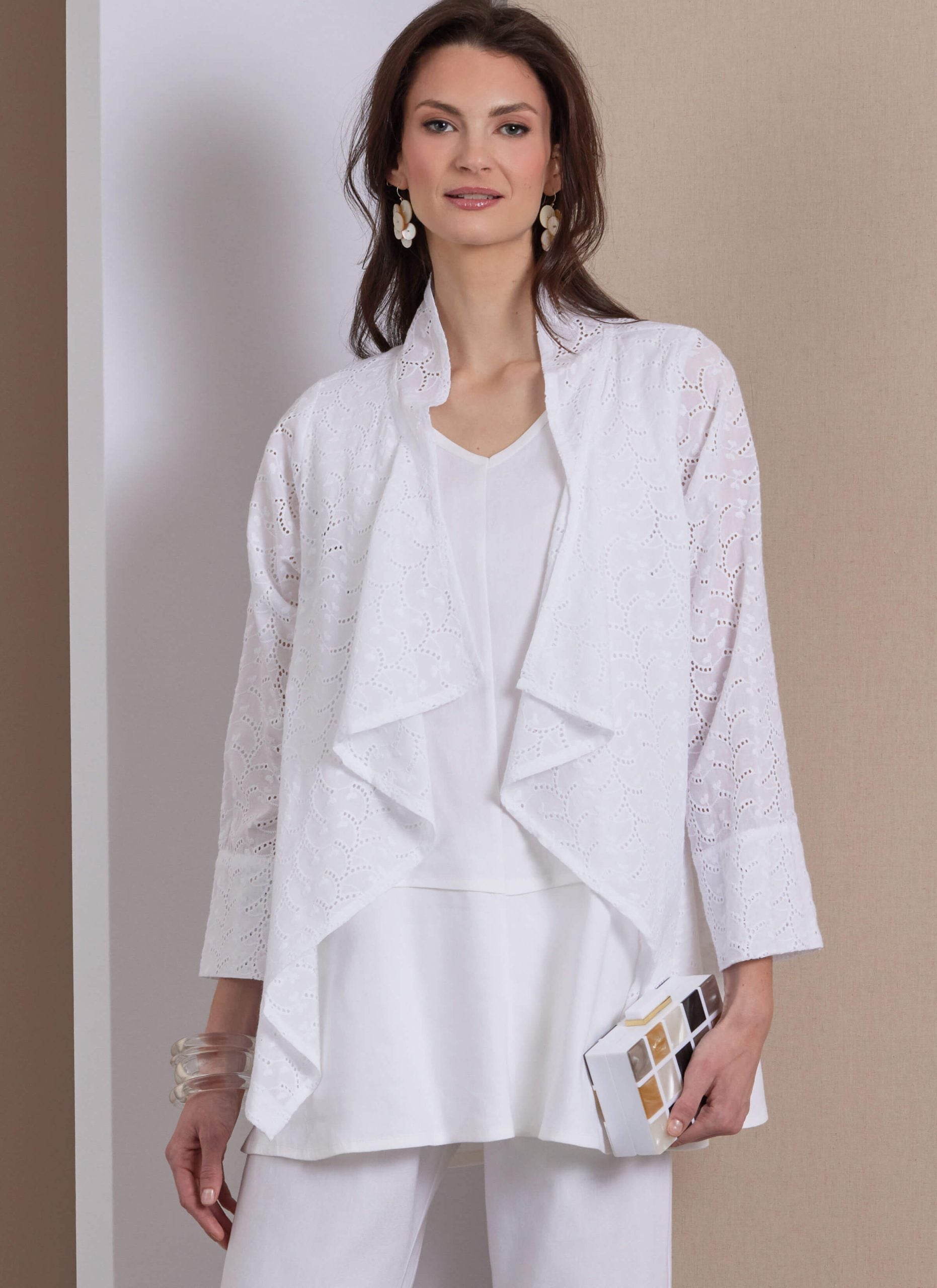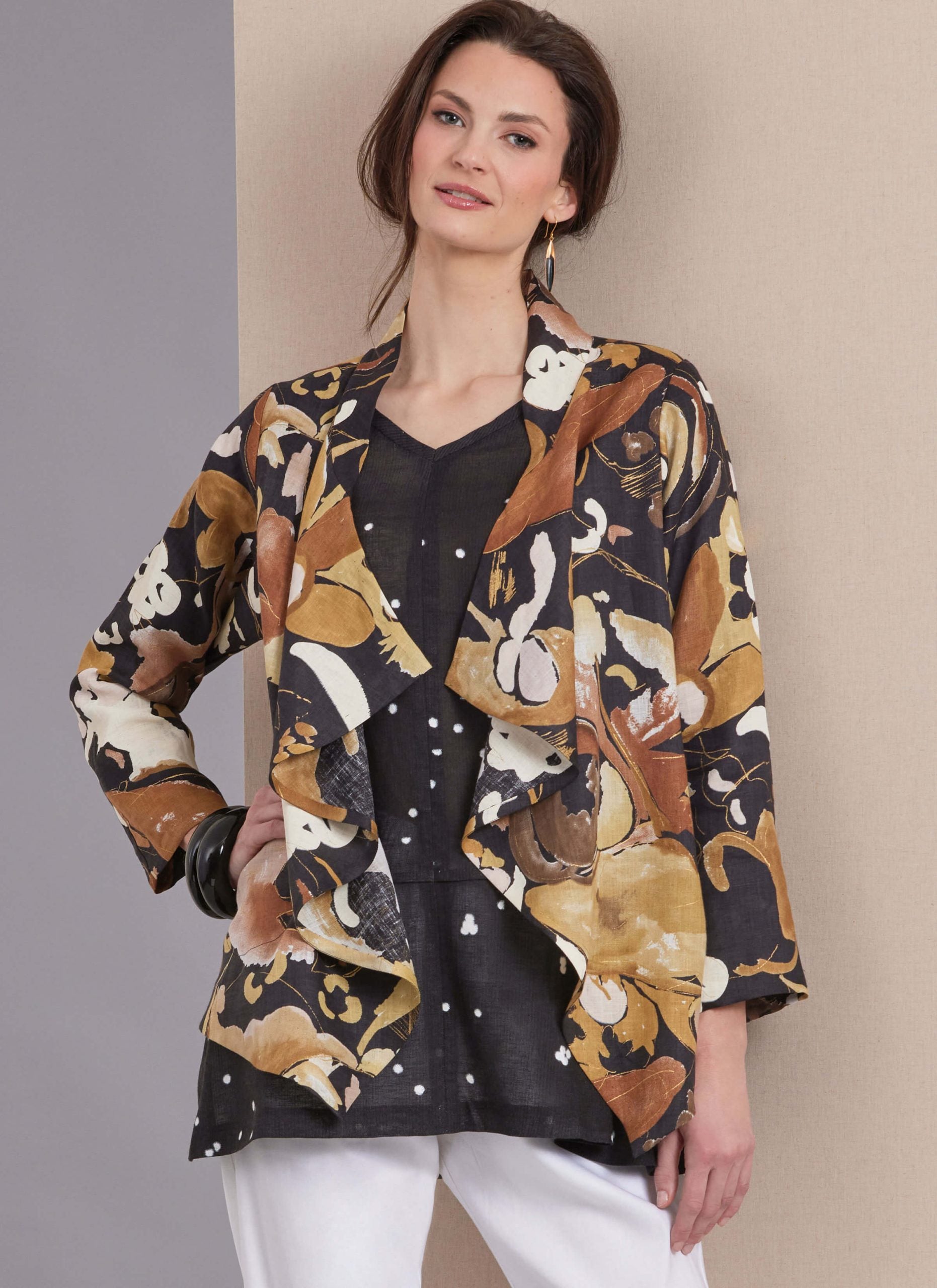 Loose-fitting jacket has in-seam stitched down pockets (optional). Set-in two piece sleeves with deep turn back hem facings. Tunics: sleeveless or 3/4 sleeve length option with self-facings, in-seam floating pockets, bias binding and front darts. Pull-on trousers have oval pockets. Sew Rating: Advanced.