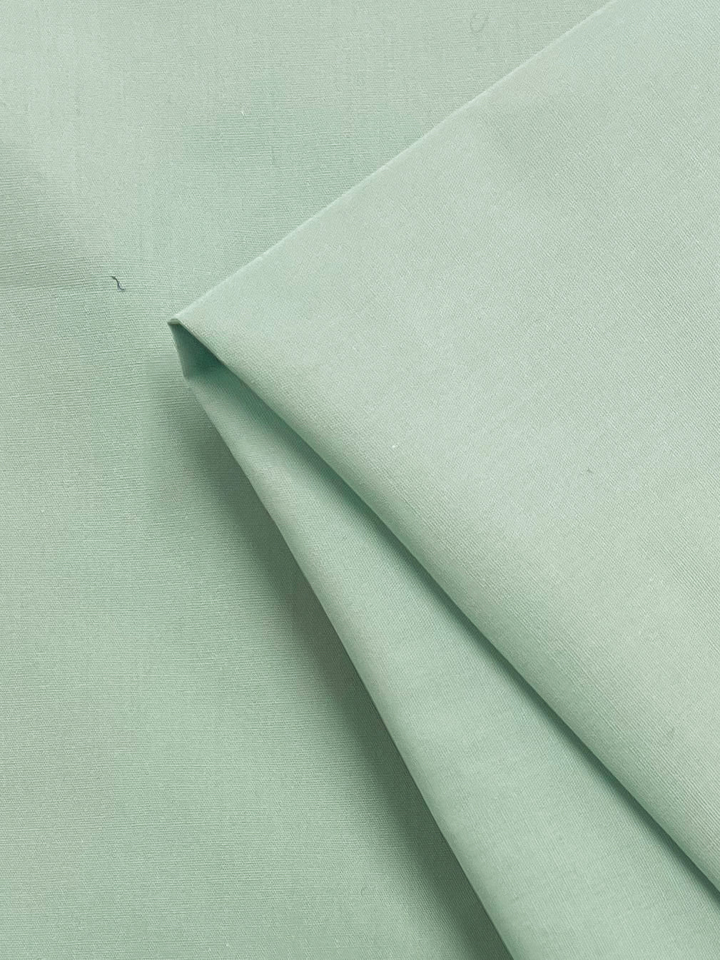 A close-up of Super Cheap Fabrics’ Plain Cotton - Aqua Foam - 150cm shows its neatly folded, soft light green fabric with a smooth finish. Made from 100% cotton, this lightweight fabric combines comfort and elegance.