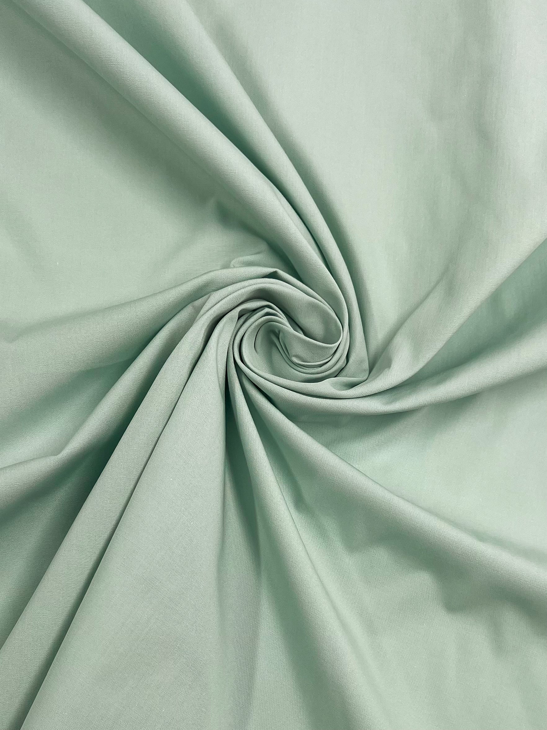 Super Cheap Fabrics' Plain Cotton - Aqua Foam - 150cm features light green 100% cotton, gathered and twisted into a central swirl, creating soft folds and a textured look on smooth, lightweight fabric.