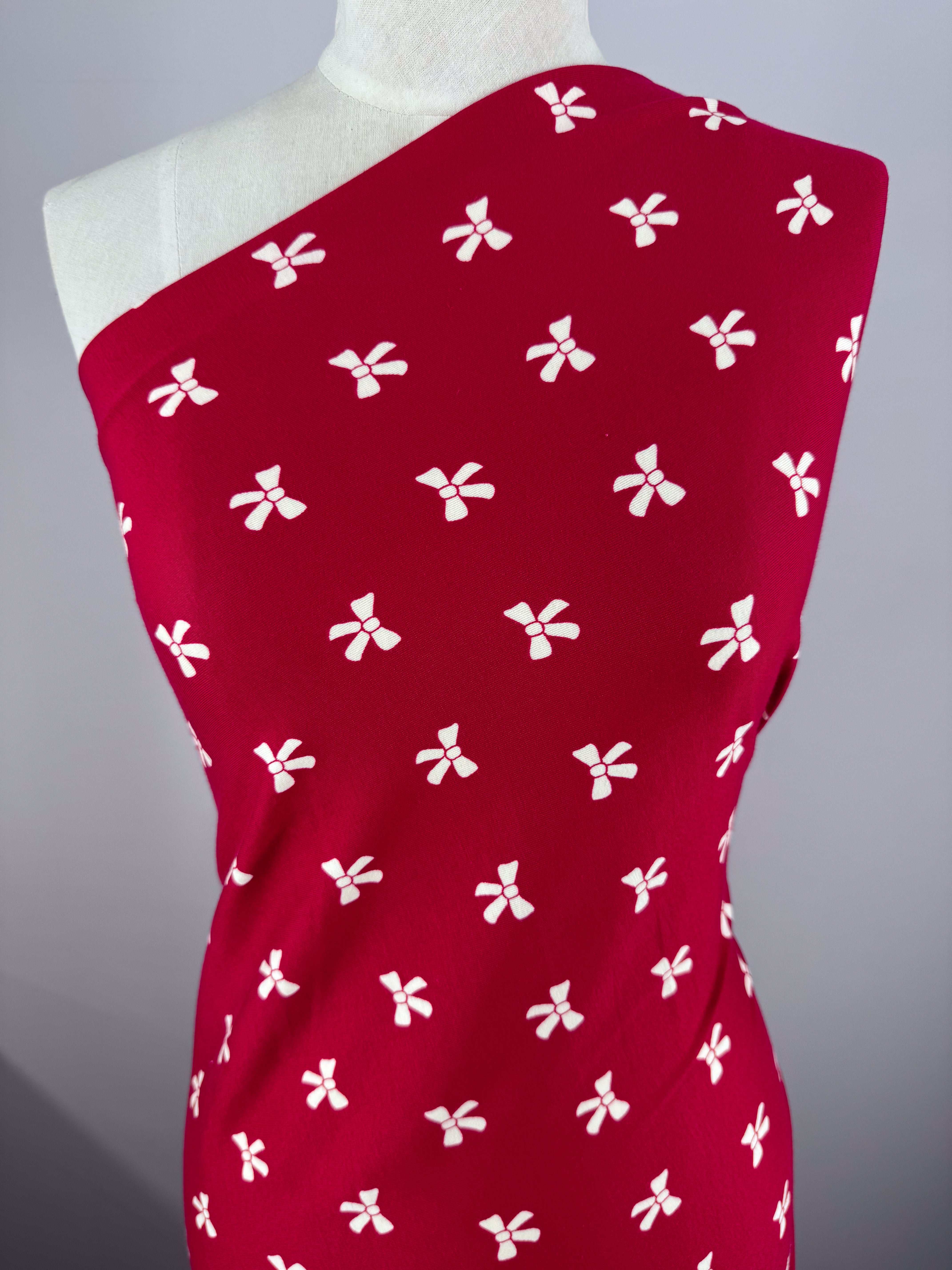 A mannequin displays the "Printed Cotton Lycra - Bow - 150cm" by Super Cheap Fabrics, featuring small white bows on a deep Urban Red background of medium-weight lycra fabric.