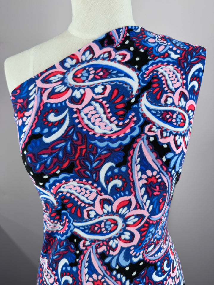 Our Printed Lycra is a Polyester/Spandex fabric that has a two-way stretch and comes in a variety of beautiful prints! Printed Lycra is a medium-weight fabric, has good durability and stretch, and washes well. Our Lycras are perfect for making tops, dresses, skirts, pants, accessories, and even childrenswear. An intricate multi-coloured paisley with teal, orange, pink, and green accents.