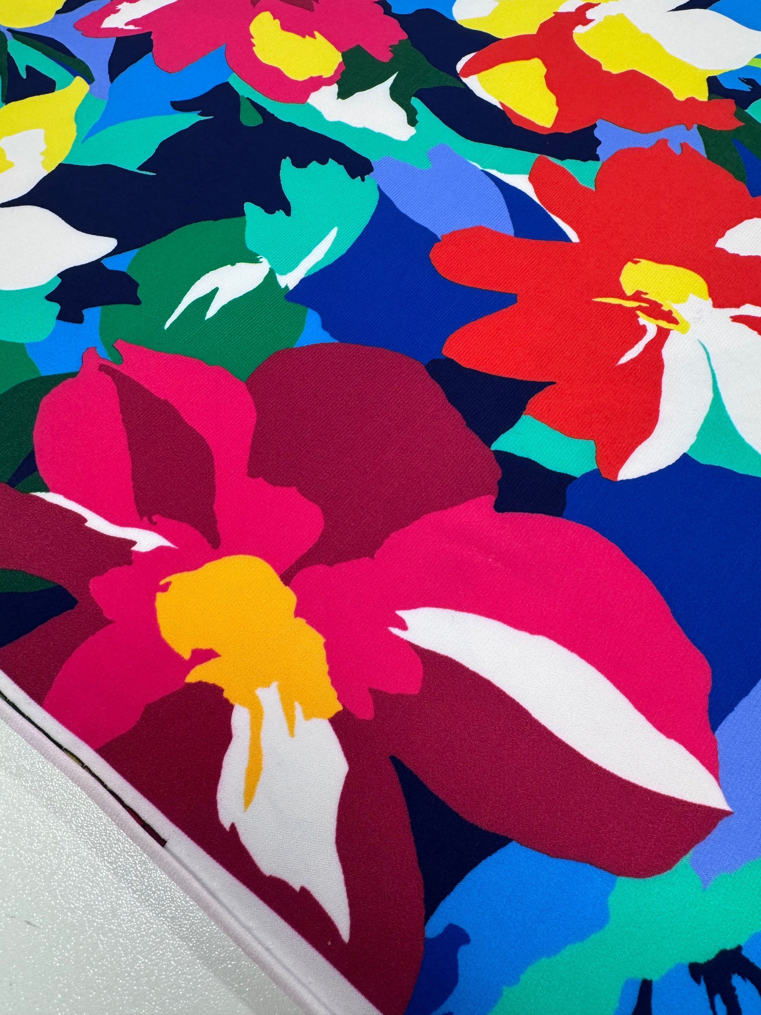 Our Printed Lycra is a Polyester/Spandex fabric that has a two-way stretch and comes in a variety of beautiful prints! Printed Lycra is a medium-weight fabric, has good durability and stretch, and washes well. Our Lycras are perfect for making tops, dresses, skirts, pants, accessories, and even childrenswear. An intricate multi-coloured paisley with teal, orange, pink, and green accents.