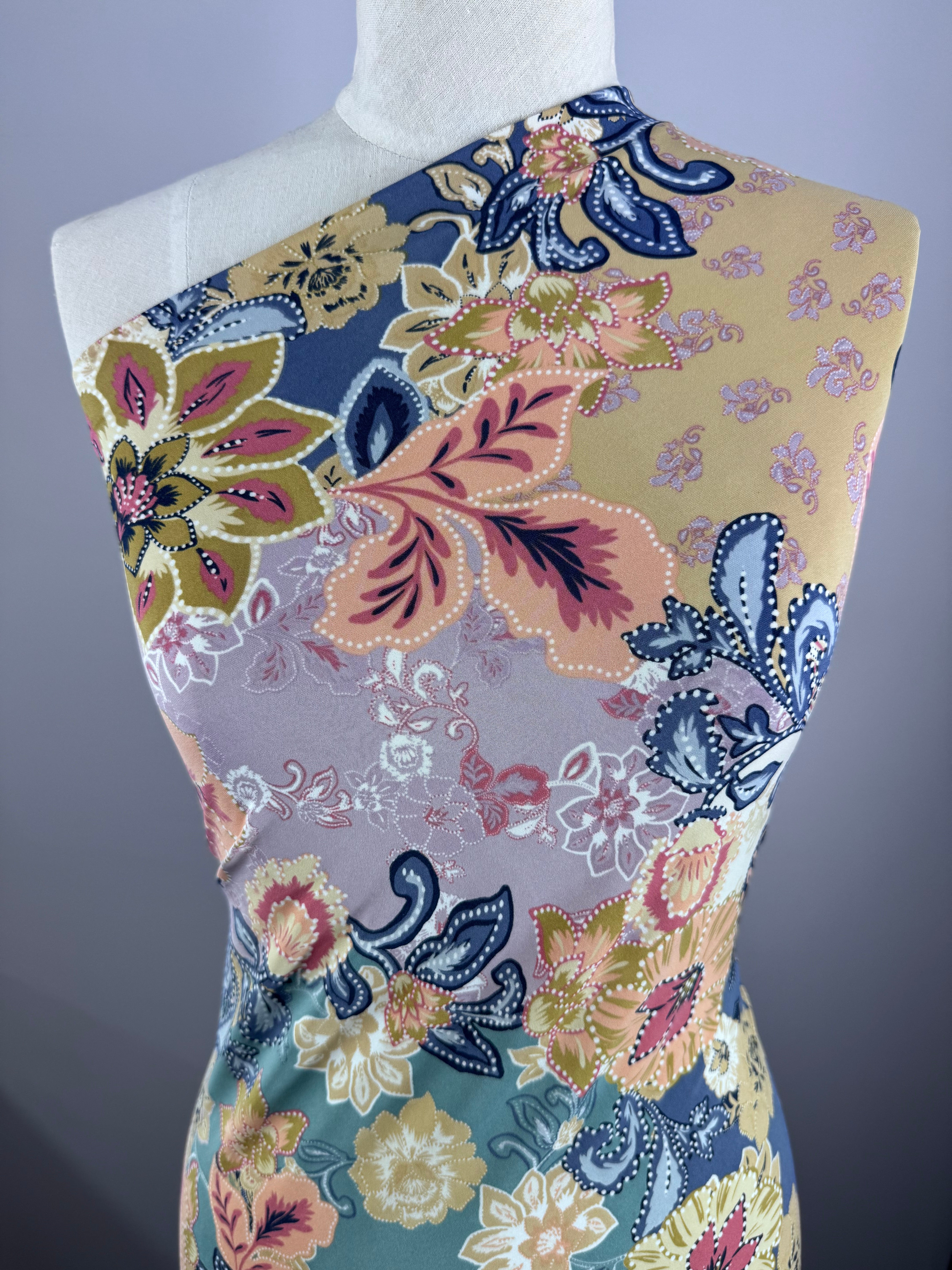 Our Printed Lycra is a Polyester/Spandex fabric that has a two-way stretch and comes in a variety of beautiful prints! Printed Lycra is a medium-weight fabric, has good durability and stretch, and washes well. Our Lycras are perfect for making tops, dresses, skirts, pants, accessories, and even childrenswear.