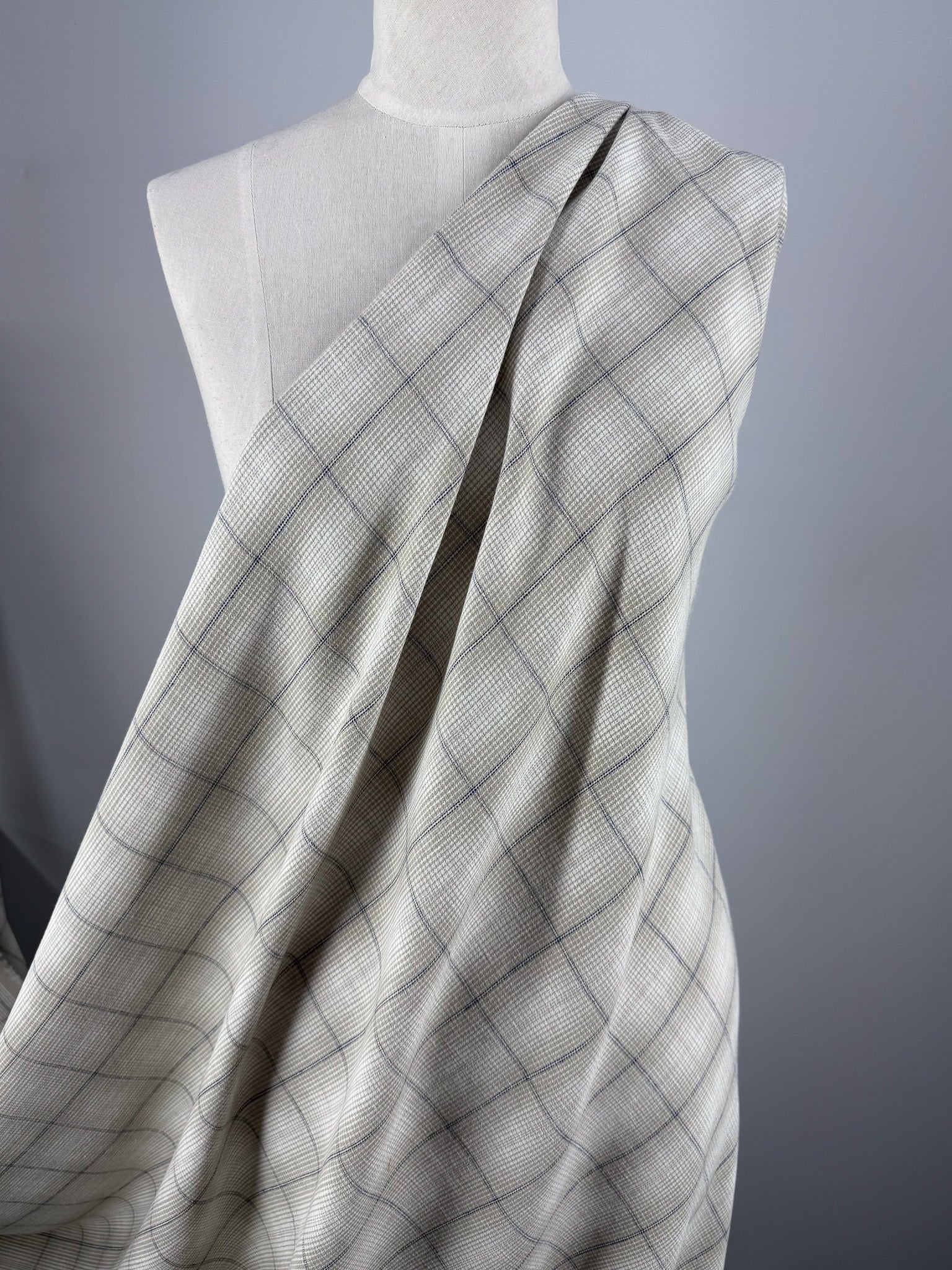 A peyote, white and navy pure linen overcheck tweed.