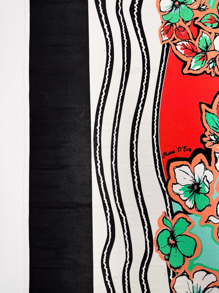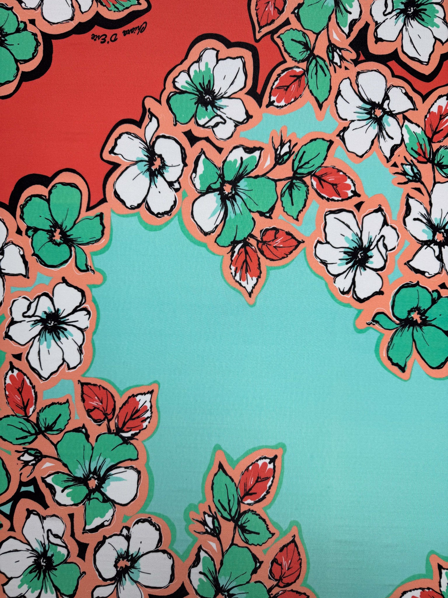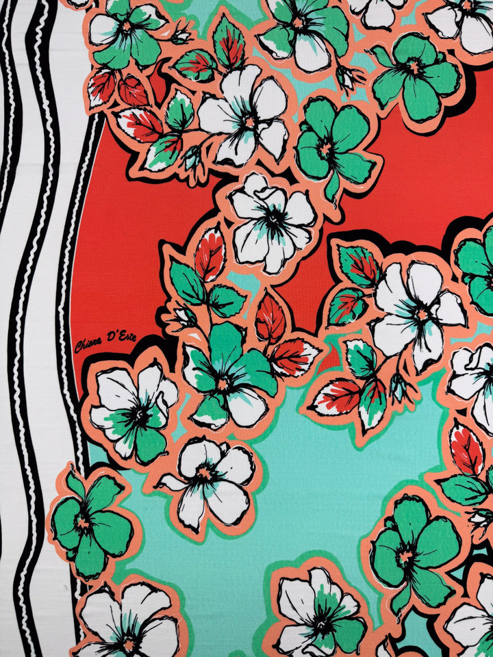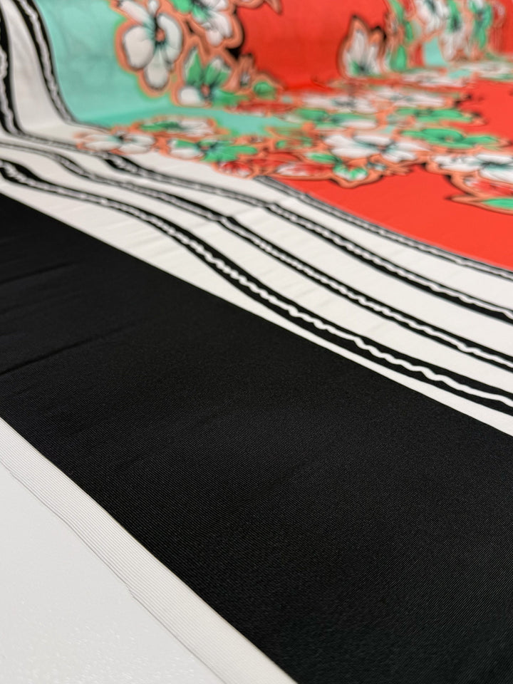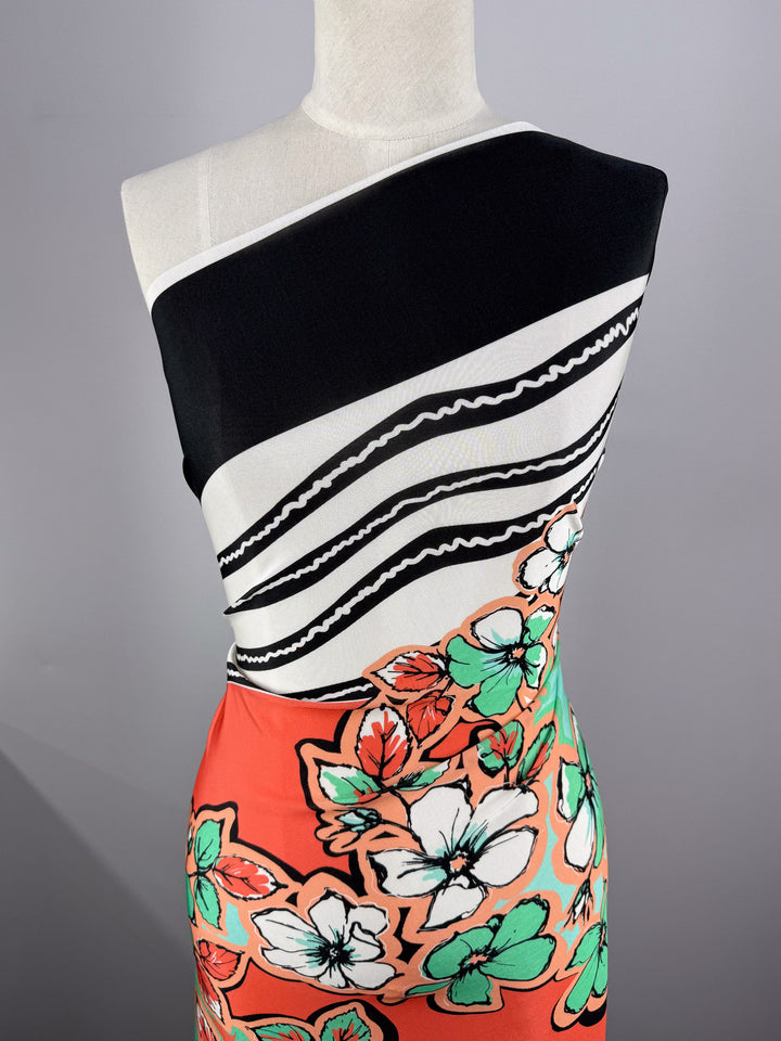 A floral viscose jersey border Print. Fun mix of sketchy florals, stripes, and vibrant coral.